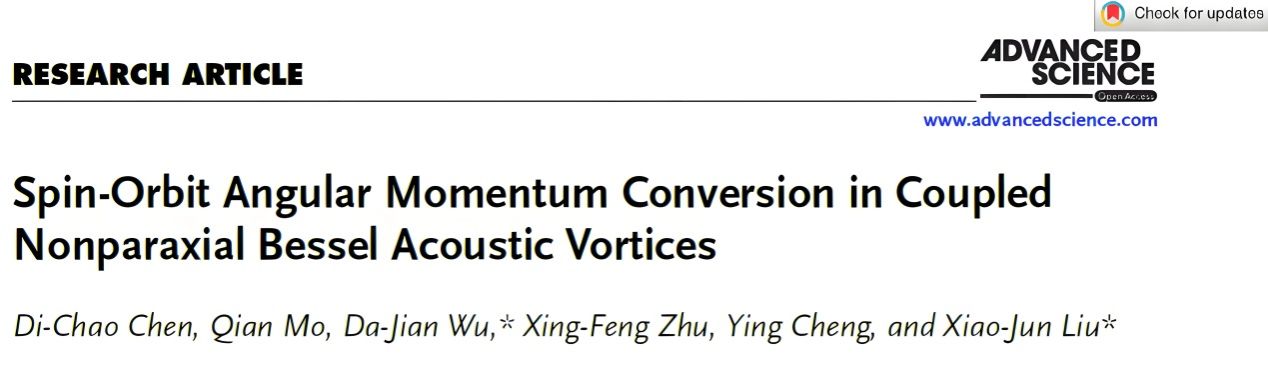 近日,网赌 吴大建教授课题组在声自旋轨道角动量转换领域取得重要研究进展。相关成果以“Spin-Orbit Angular Momentum Conversion in Coupled Nonparaxial Bessel Acoustic Vortices”为题发表在《Advanced Science》上。南师大网赌 陈帝超博士为论文第一作者,吴大建教授和南京大学刘晓峻教授是论文共同通讯作者,南京师范大学网赌 是论文第一单位。《Advanced Science》是国际权威期刊、中科院综合类一区TOP期刊,最新影响因子为14....