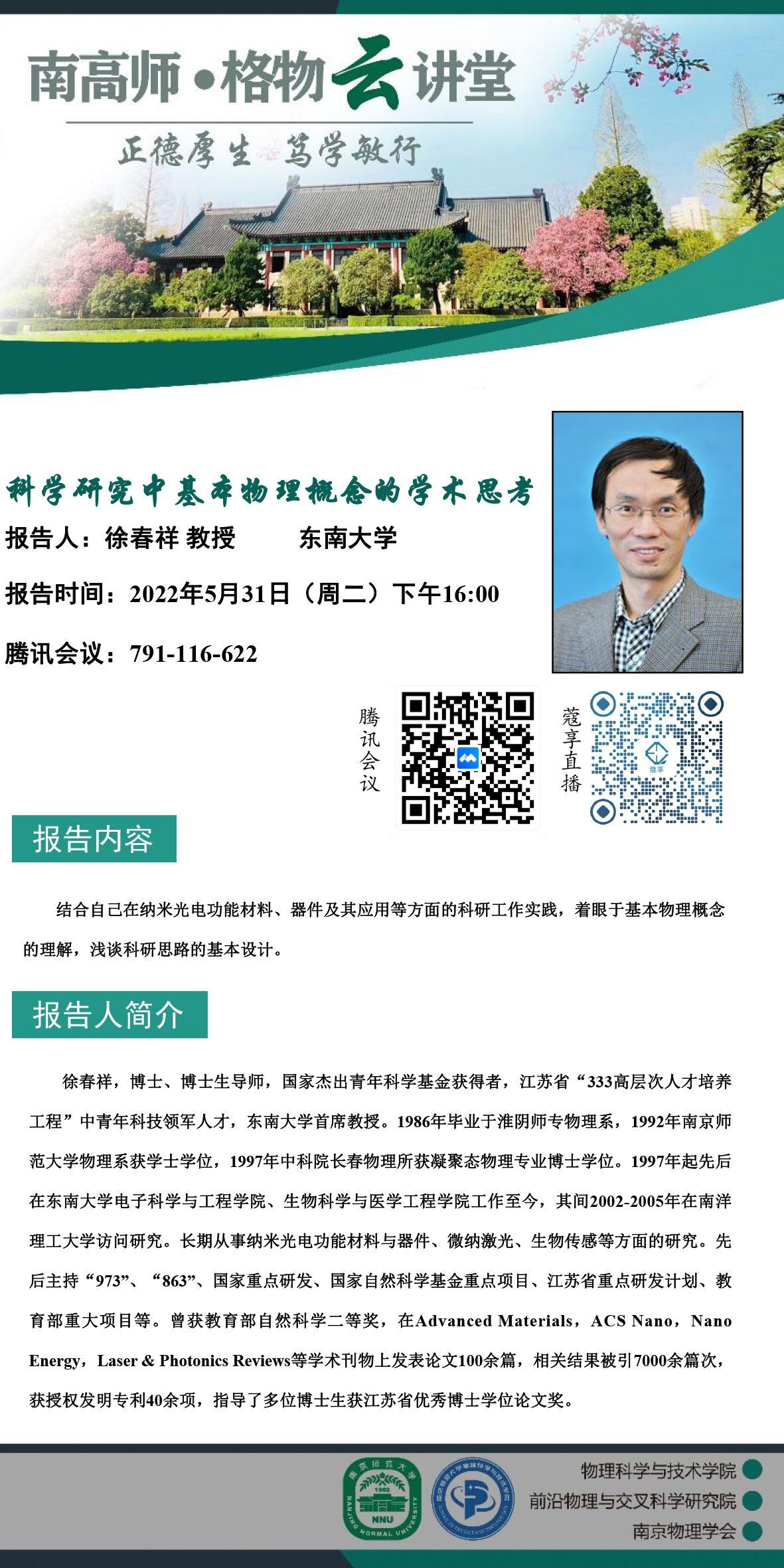 【学术预告】“南高师·格物云讲堂” 科学研究中基本物理概念的学术思考--徐春祥教授