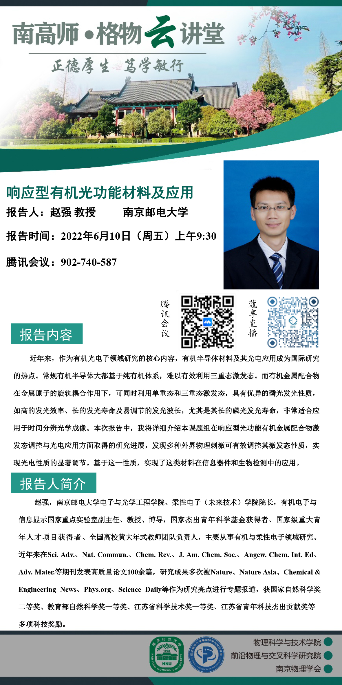【学术预告】“南高师·格物云讲堂” 响应型有机光功能材料及应用--赵强教授