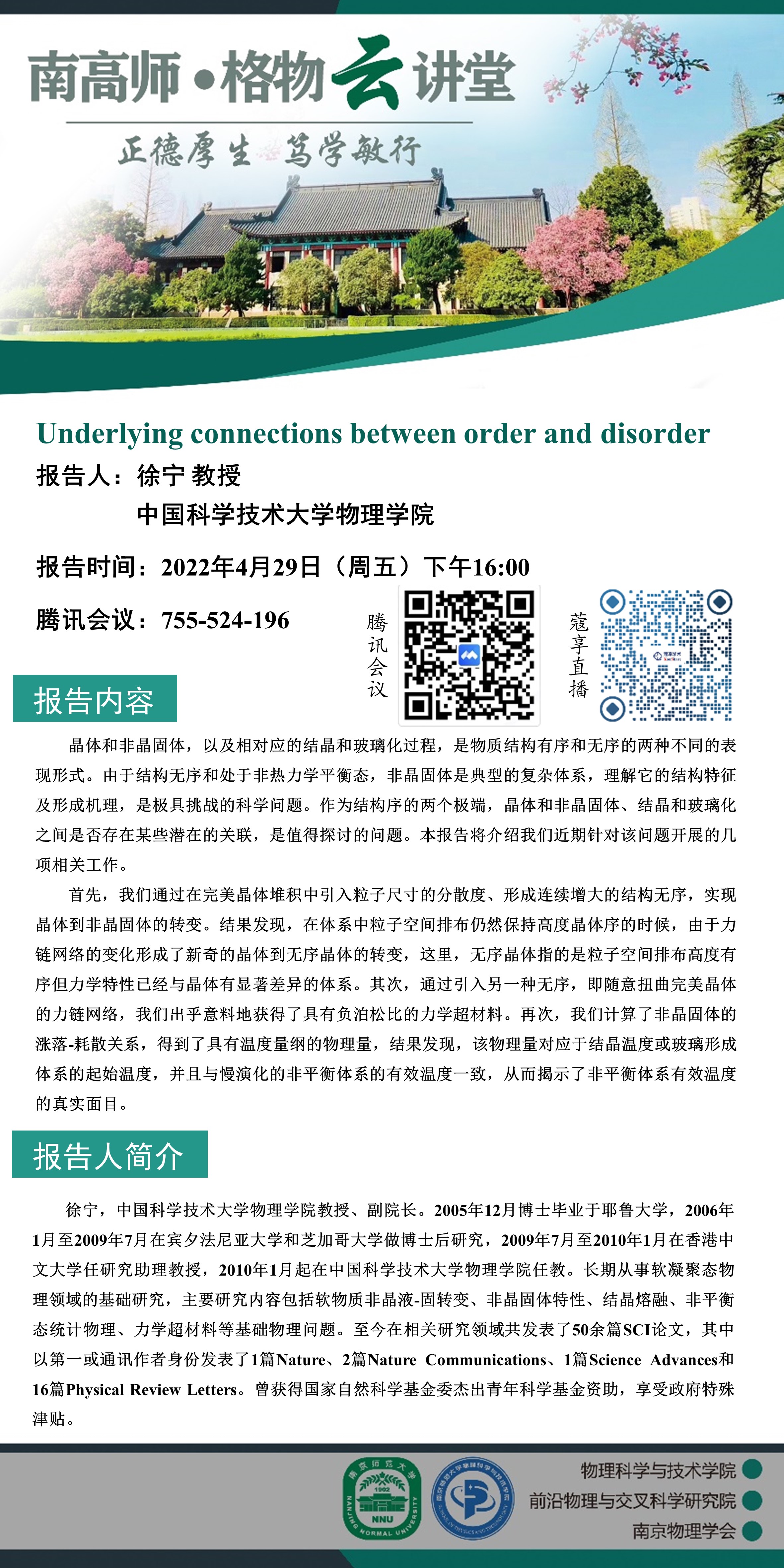 【学术预告】【南高师·格物云讲堂】 Underlying connections between order and disorder
