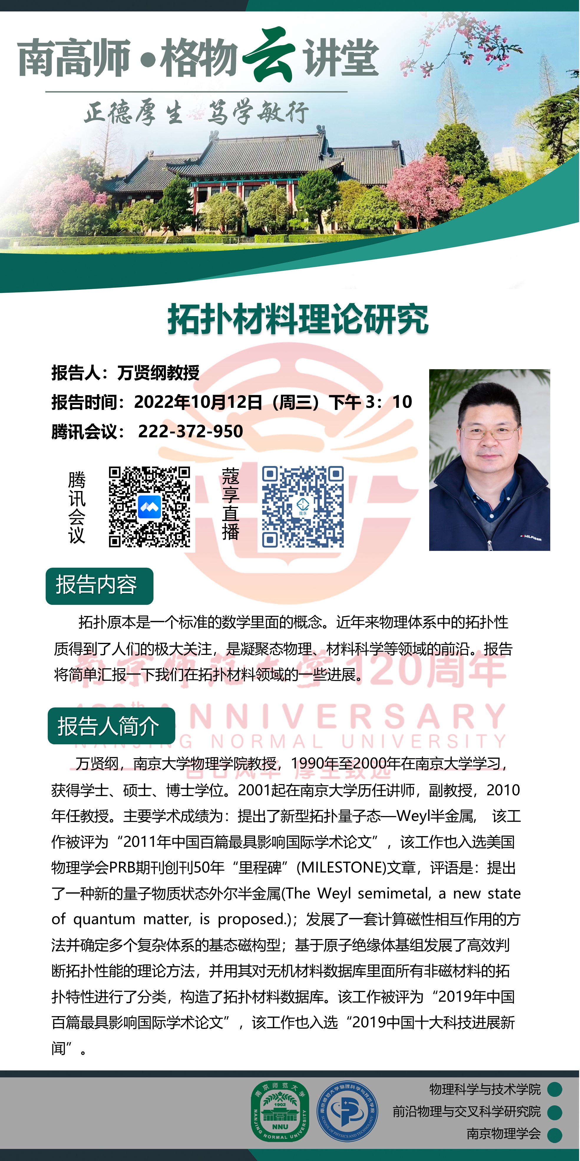 【学术预告】“南高师·格物云讲堂” 拓扑材料理论研究--万贤纲教授