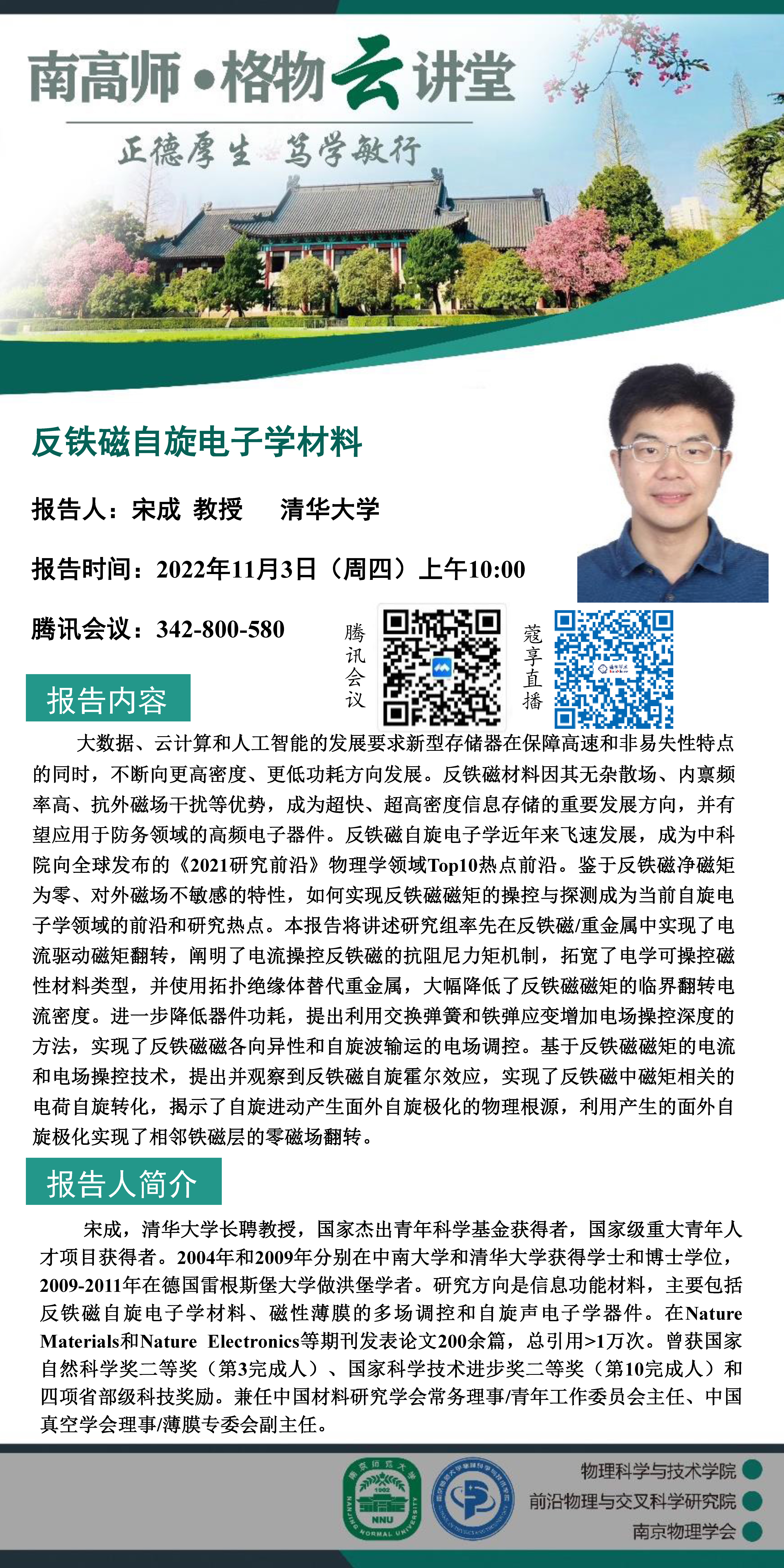 【学术预告】“南高师·格物云讲堂” 反铁磁自旋电子学材料--宋成教授