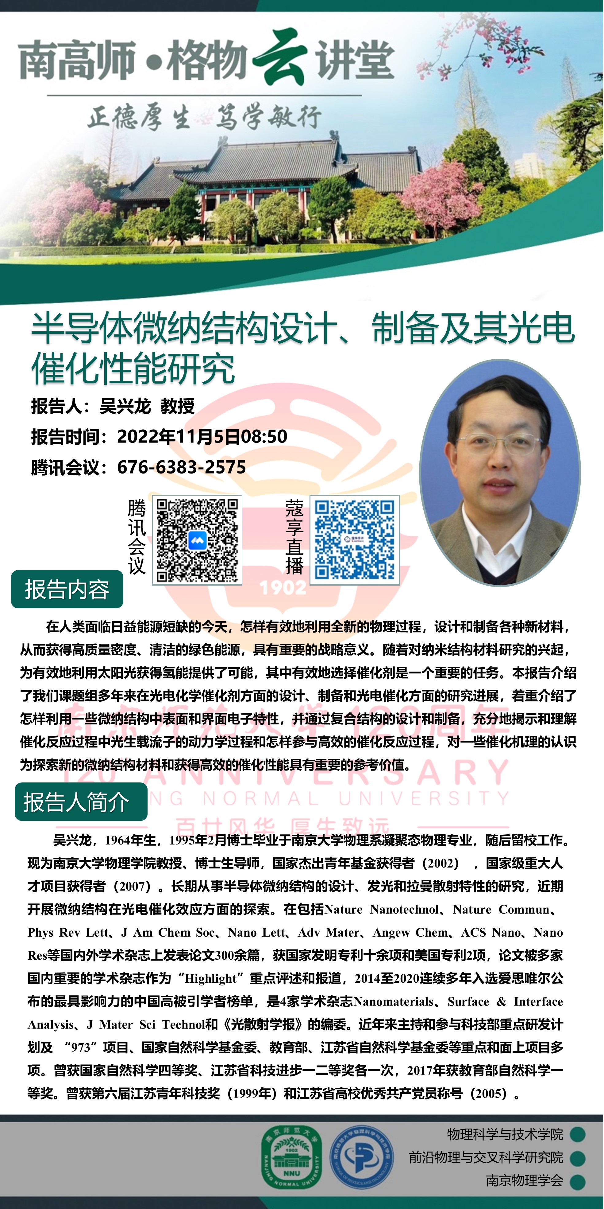 【学术预告】“南高师·格物云讲堂” 半导体微纳结构设计、制备及其光电催化性能研究--吴兴龙教授