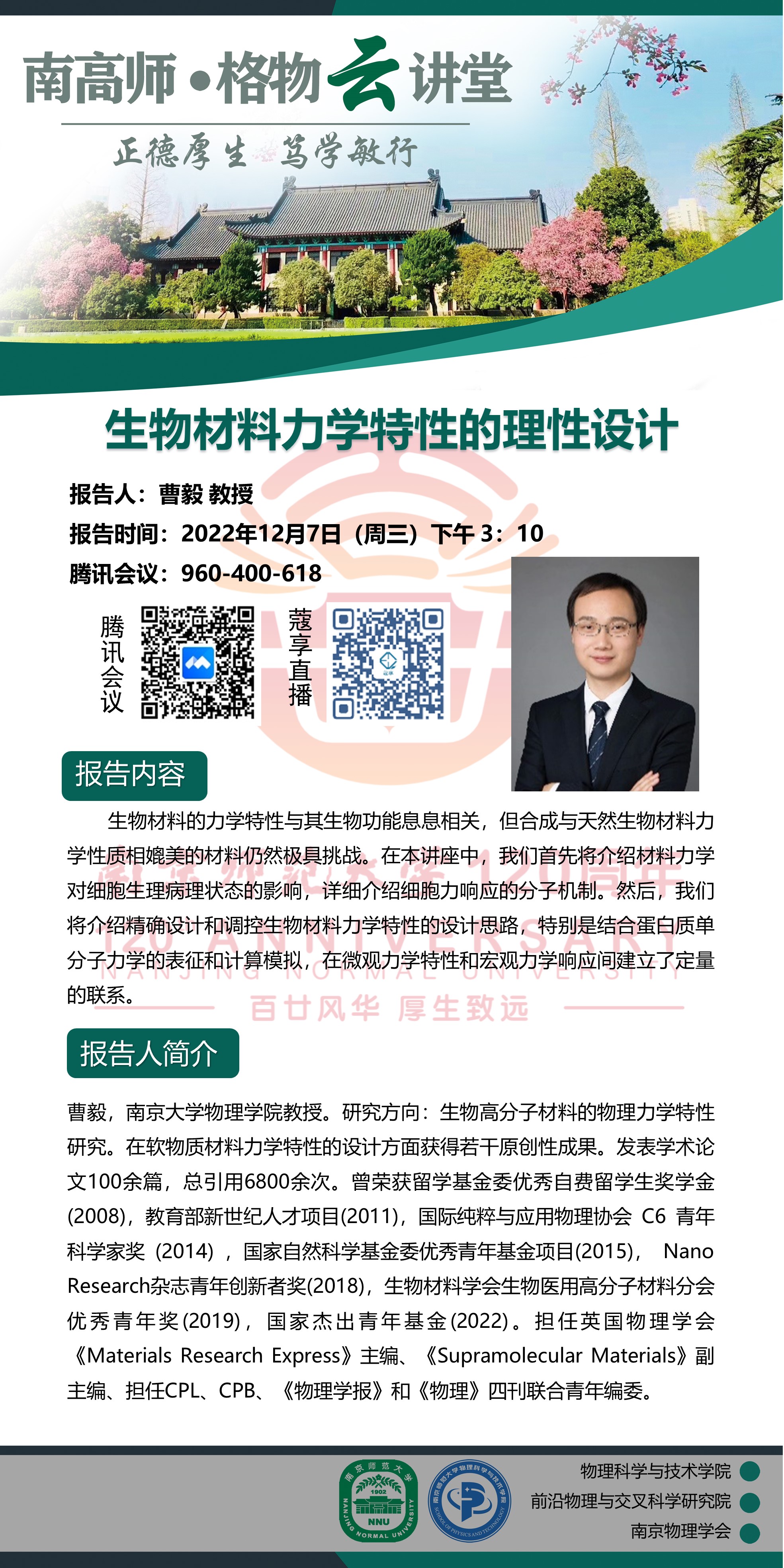 【学术预告】“南高师·格物云讲堂” 生物材料力学特性的理性设计—曹毅教授