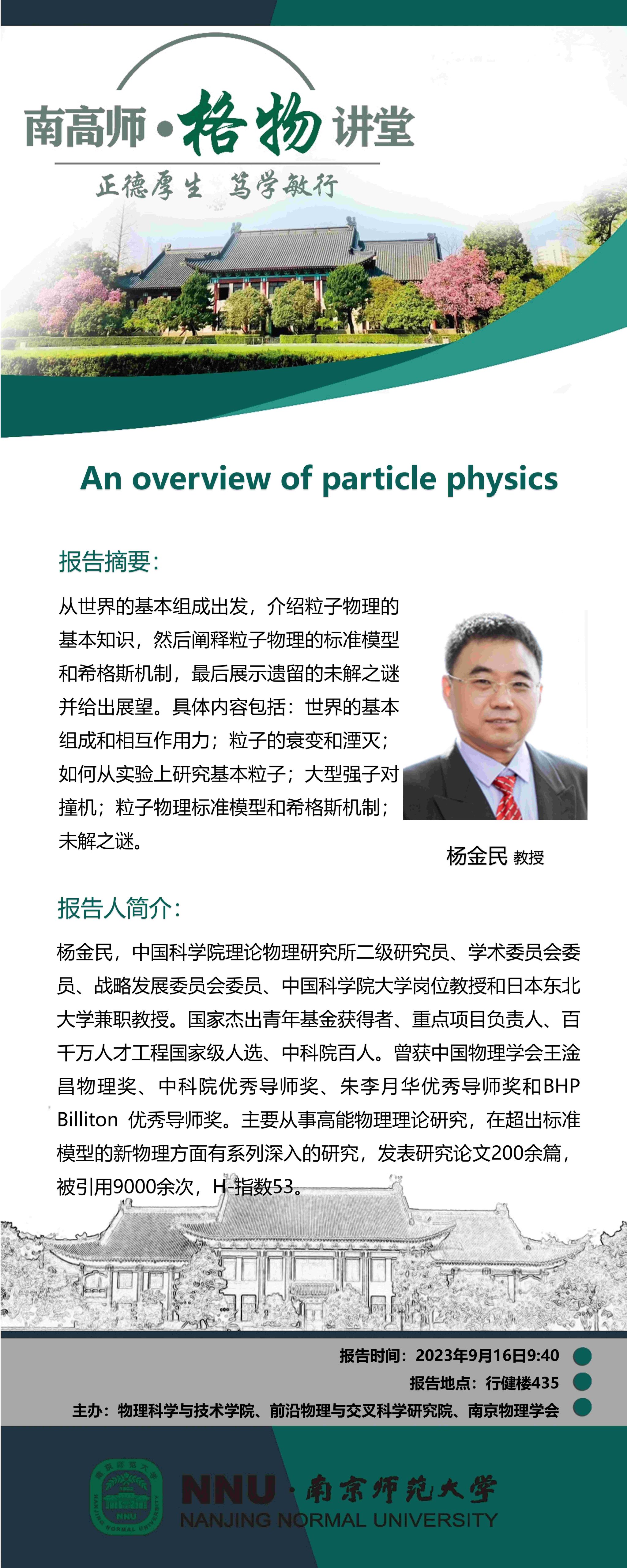【学术预告】“南高师·格物讲堂” An overview of particle physics--杨金民教授