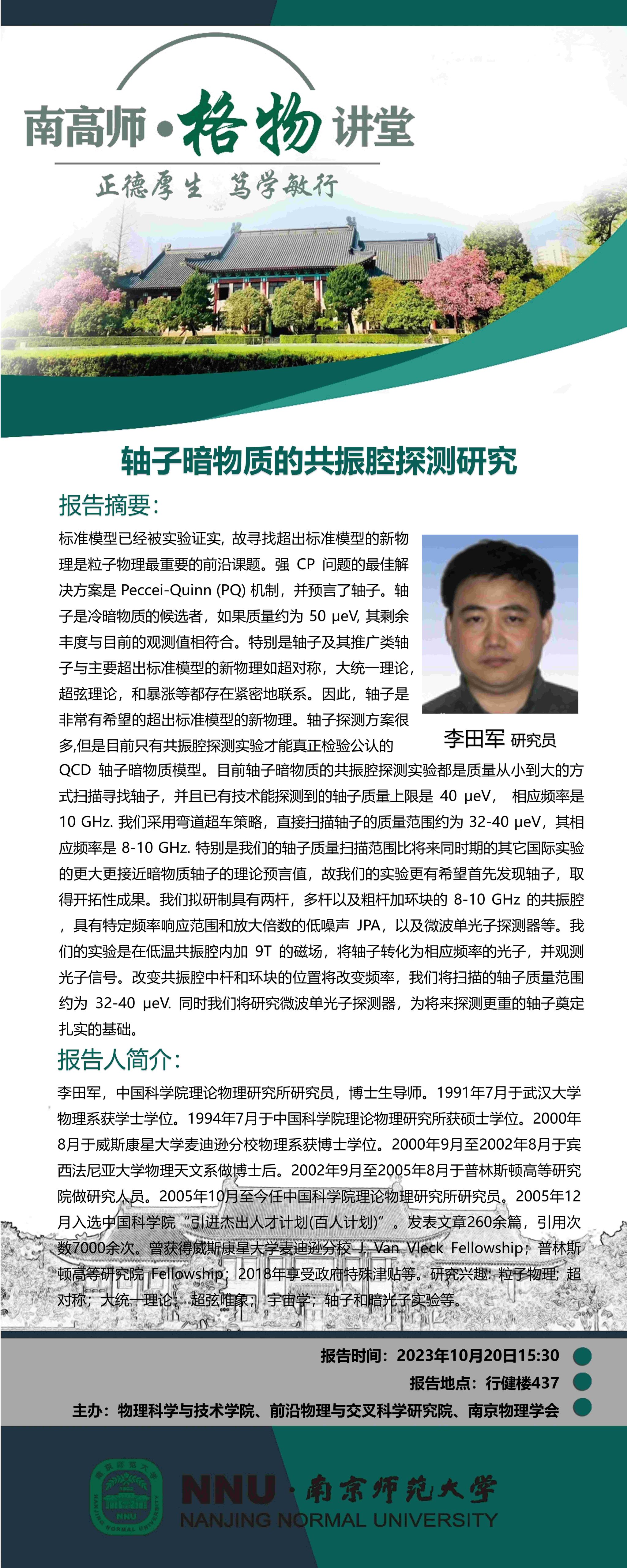 【学术预告】“南高师·格物讲堂” 轴子暗物质的共振腔探测研究--李田军研究员