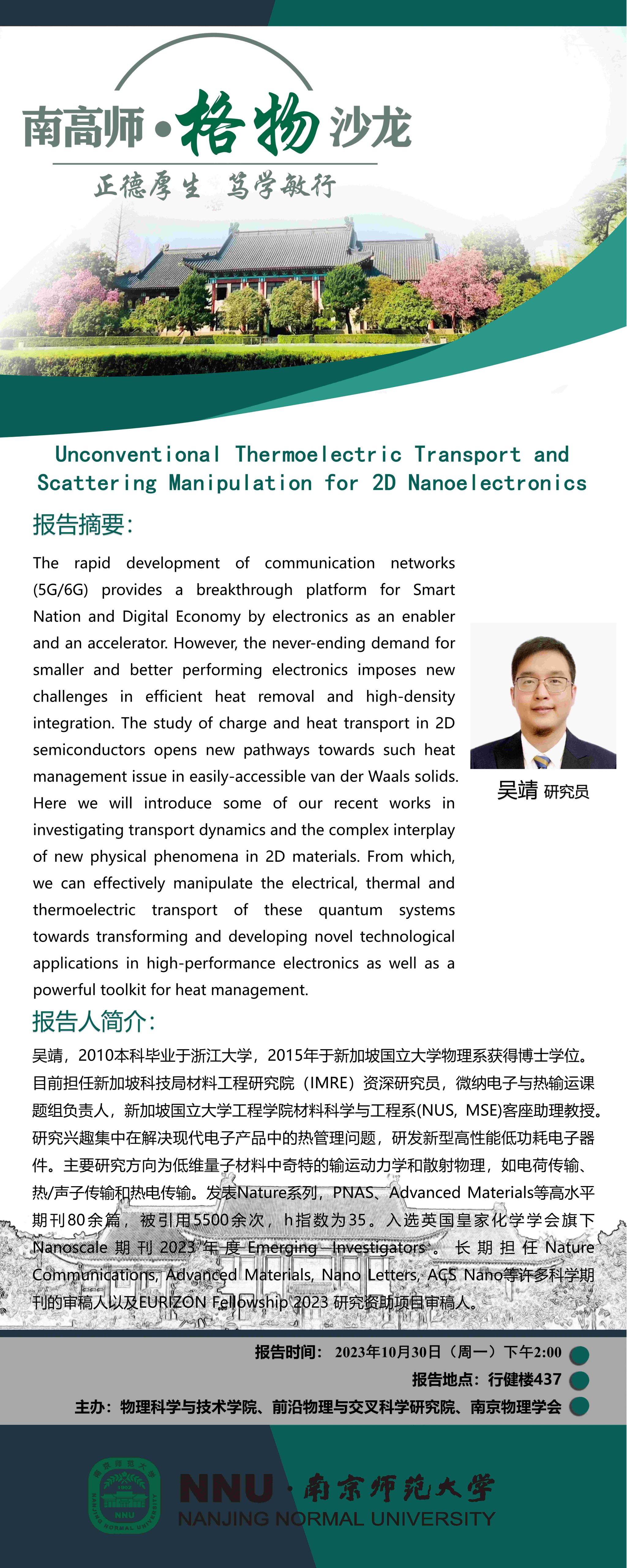 【学术预告】“南高师·格物沙龙”Unconventional Thermoelectric Transport and Scattering Manipulation for 2D Nanoelectronics--吴靖研究员