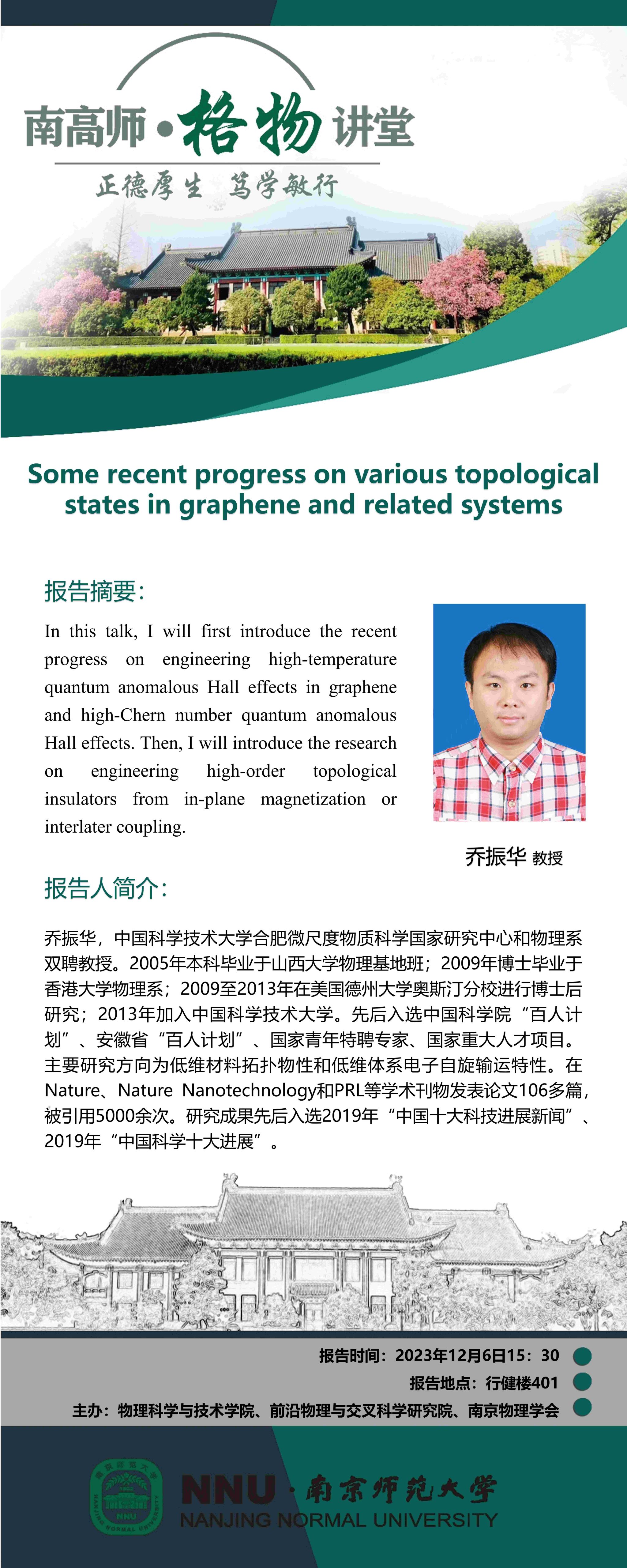 【学术预告】“南高师·格物讲堂”Some recent progress on various topological states in graphene and related systems--乔振华教授