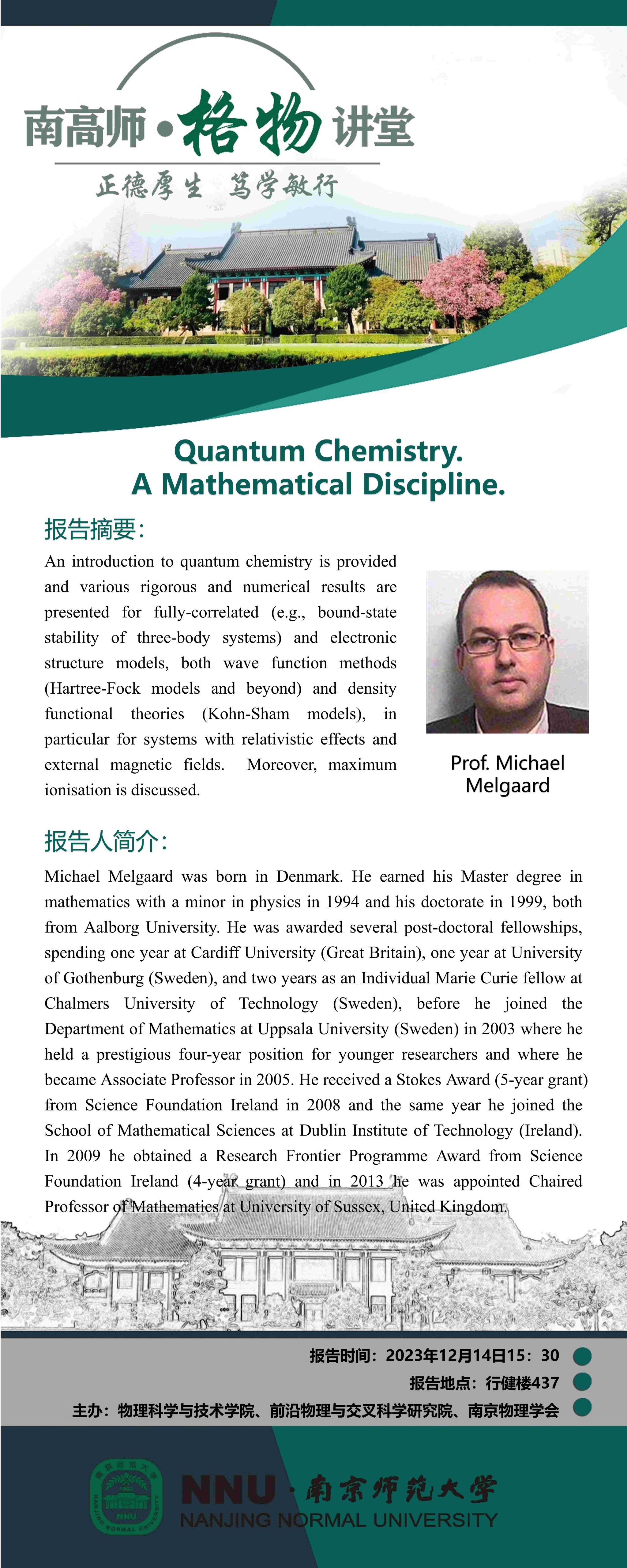 【学术预告】“南高师·格物讲堂”Quantum Chemistry. A Mathematical Discipline--Prof. Michael Melgaard