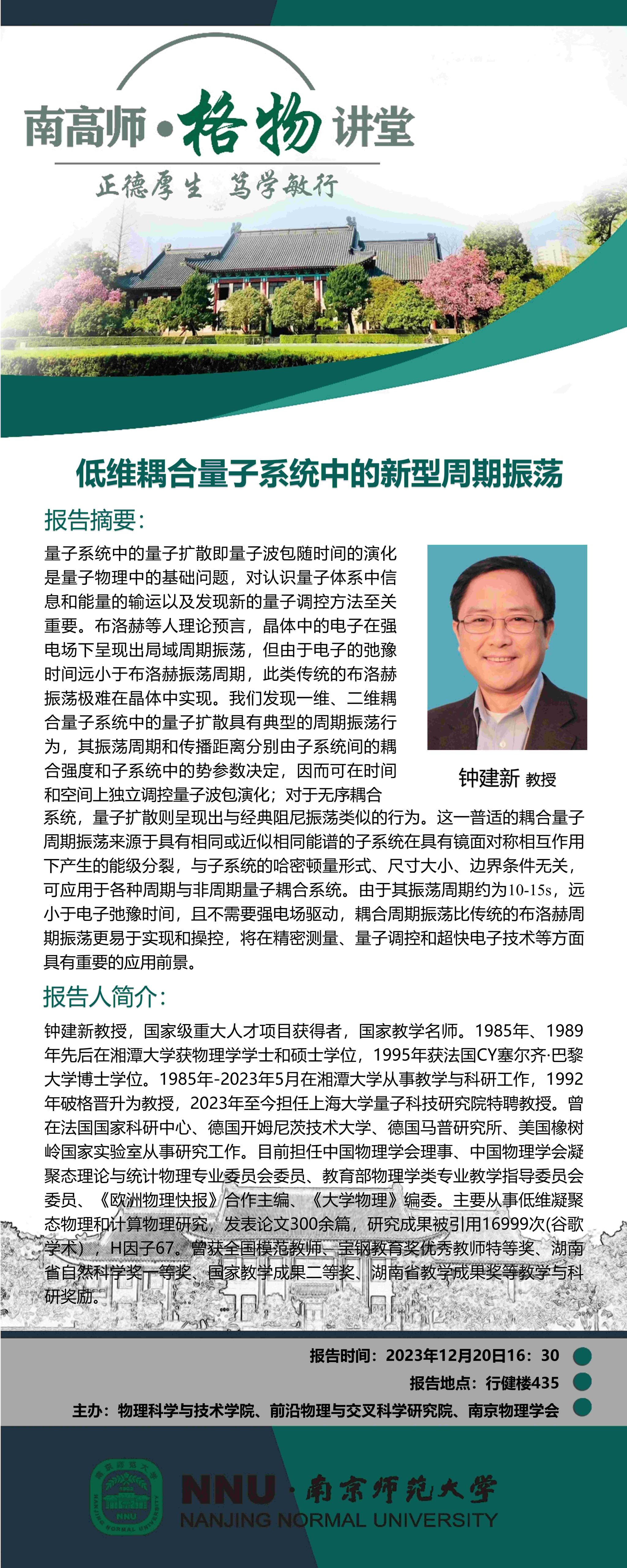 【学术预告】“南高师·格物讲堂”低维耦合量子系统中的新型周期振荡--钟建新教授