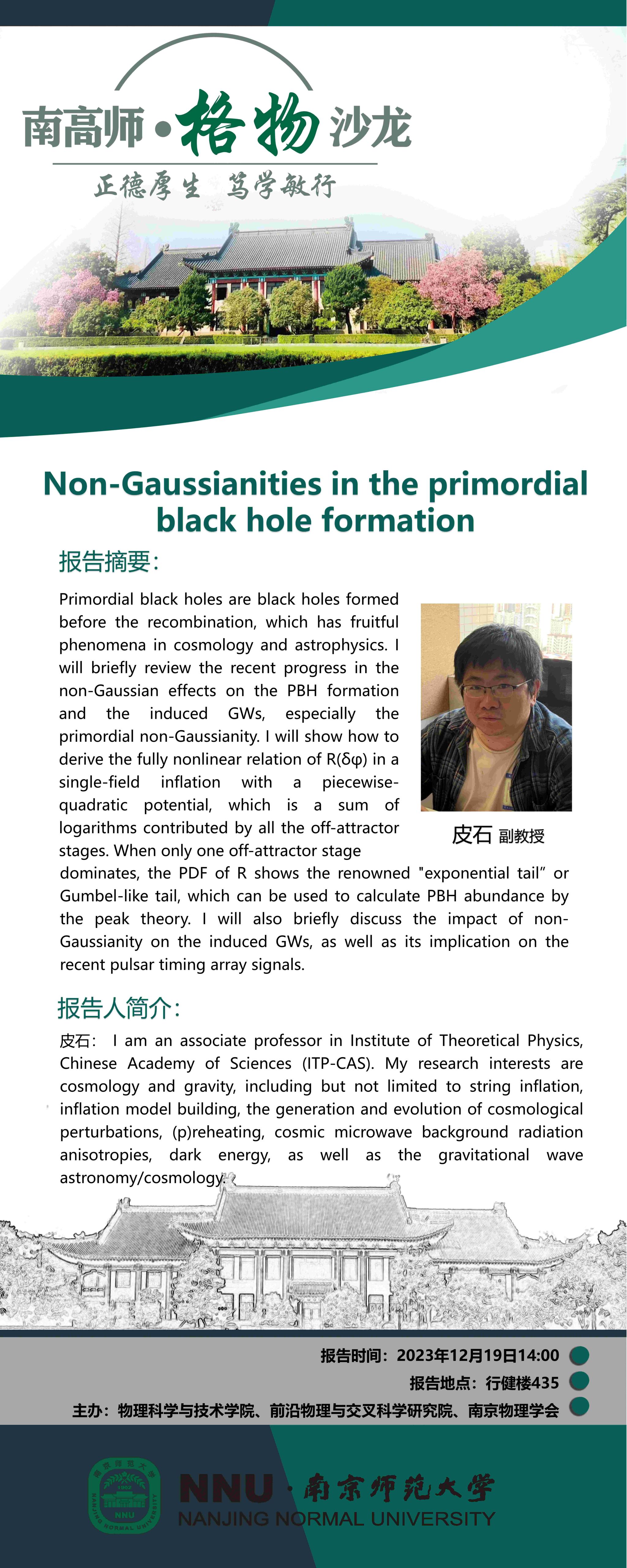 【学术预告】“南高师·格物沙龙” Non-Gaussianities in the primordial black hole formation--皮石副教授