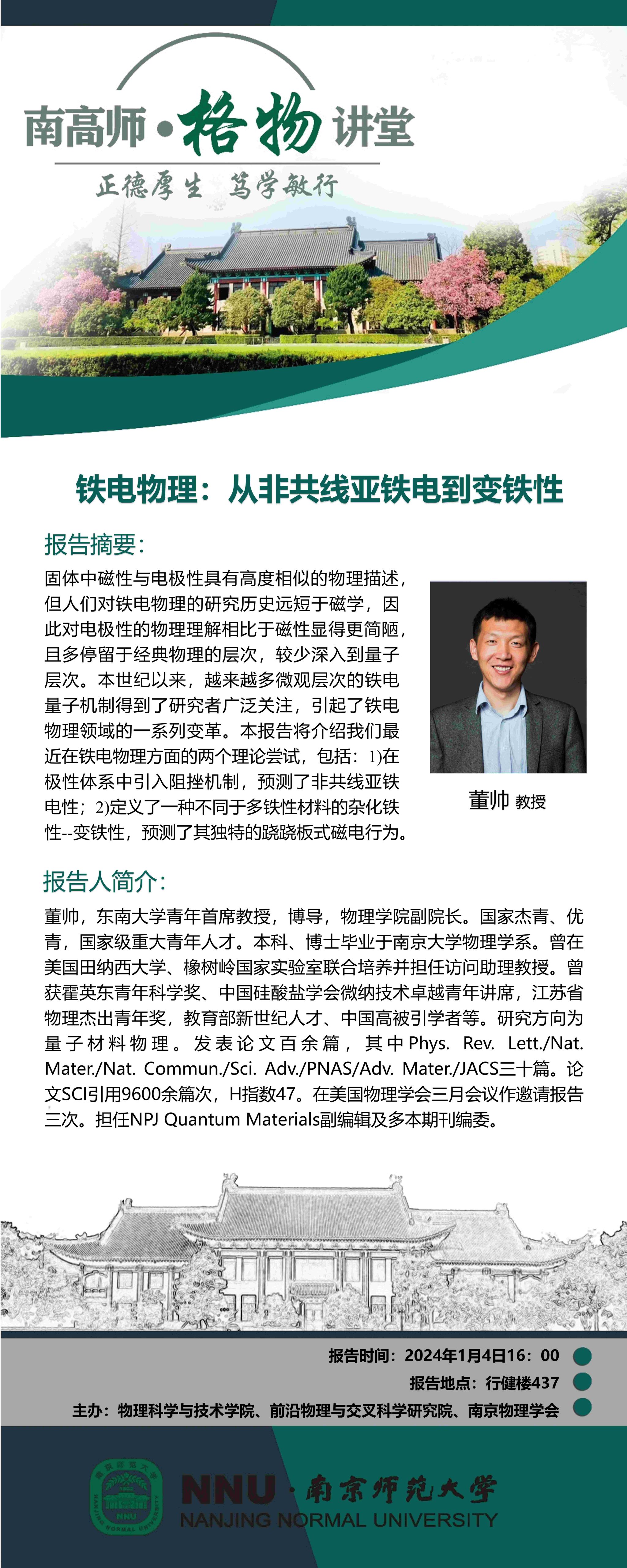 【学术预告】“南高师·格物讲堂”铁电物理:从非共线亚铁电到变铁性--董帅教授