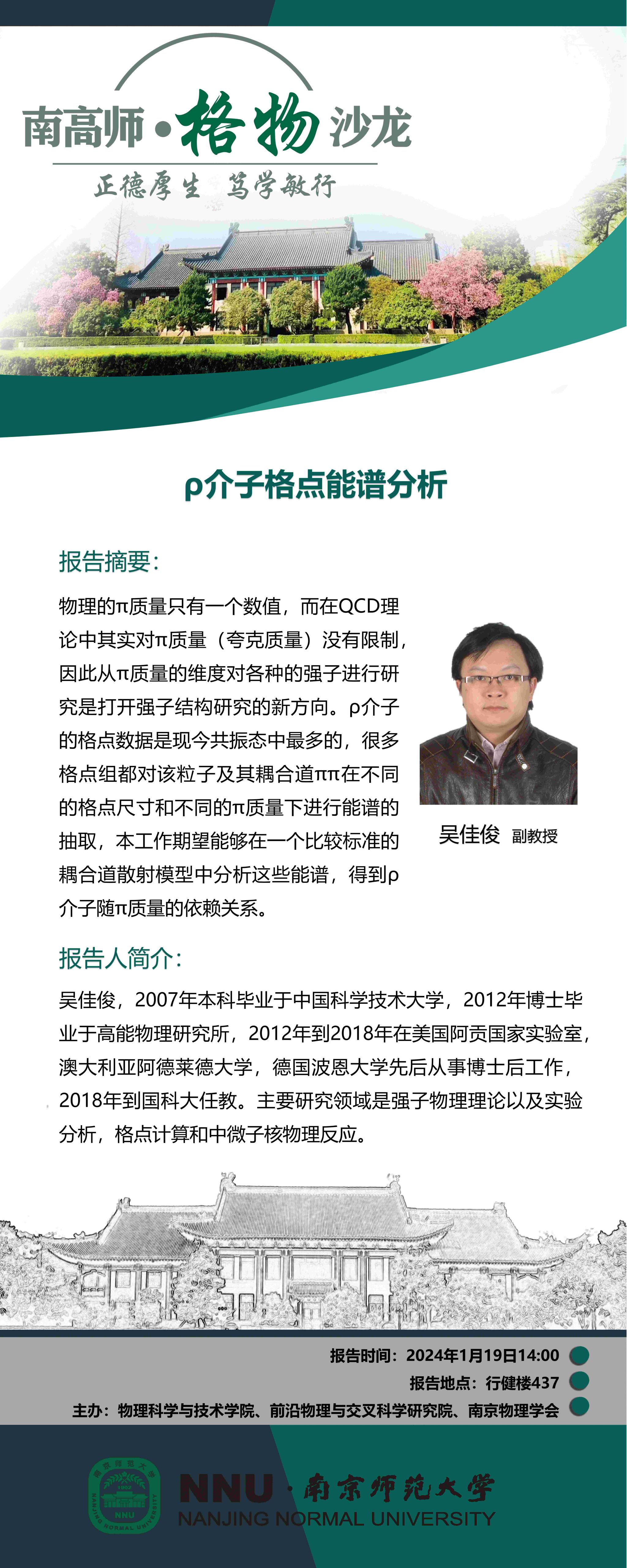 【学术预告】“南高师·格物沙龙”ρ介子格点能谱分析--吴佳俊副教授