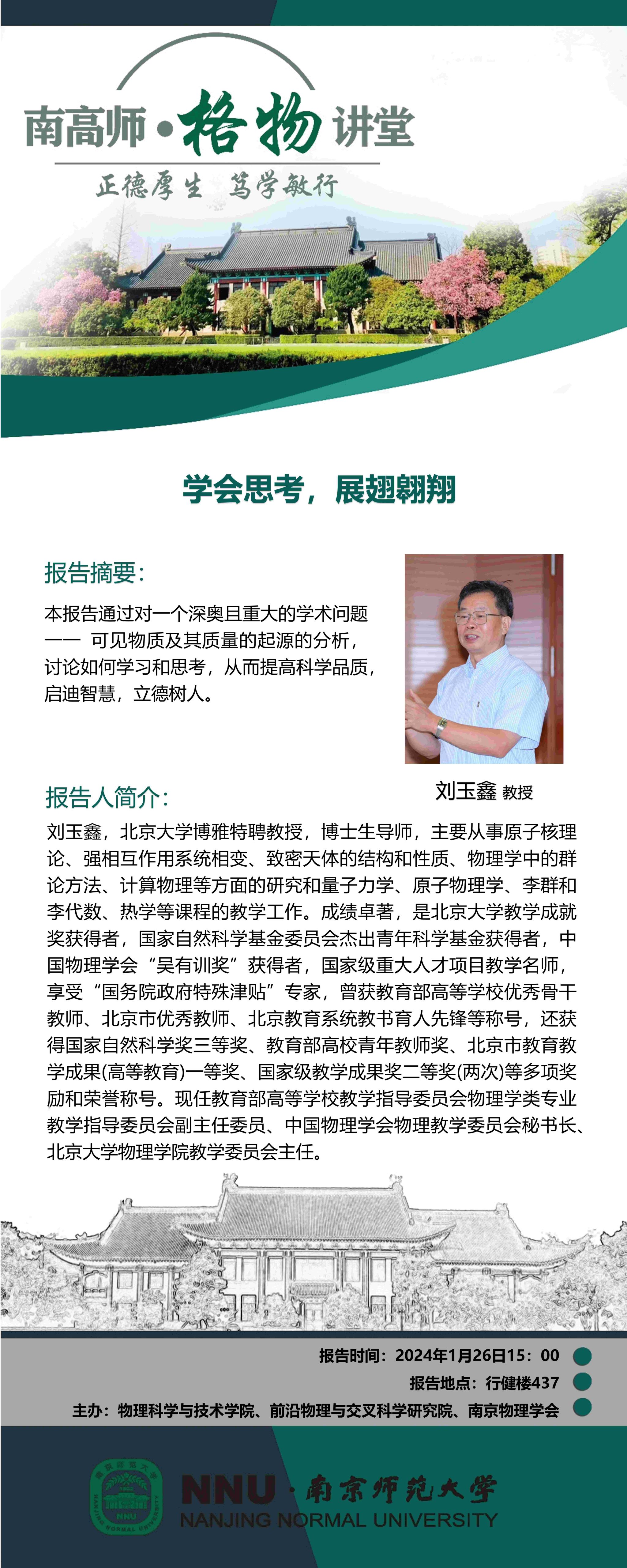 【学术预告】“南高师·格物讲堂”学会思考,展翅翱翔--刘玉鑫教授