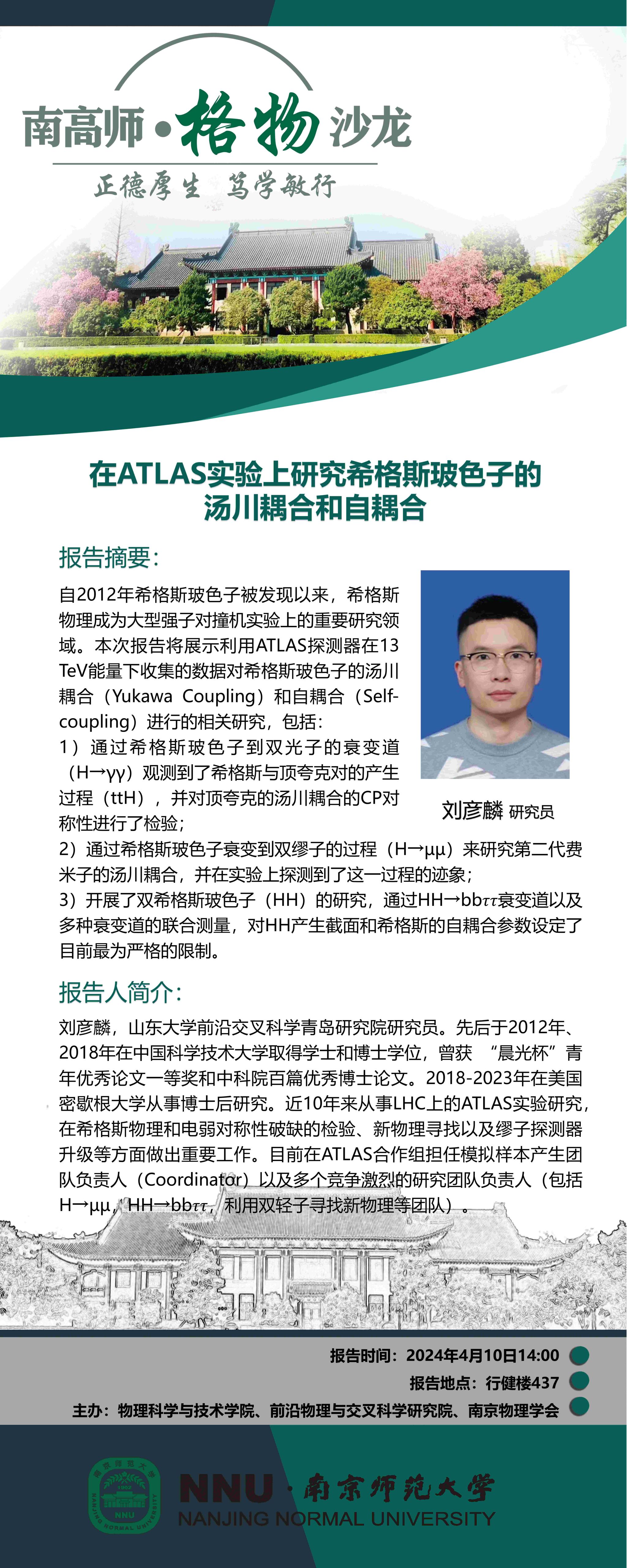 【学术预告】“南高师·格物沙龙” 在ATLAS实验上研究希格斯玻色子的汤川耦合和自耦合--刘彦麟研究员