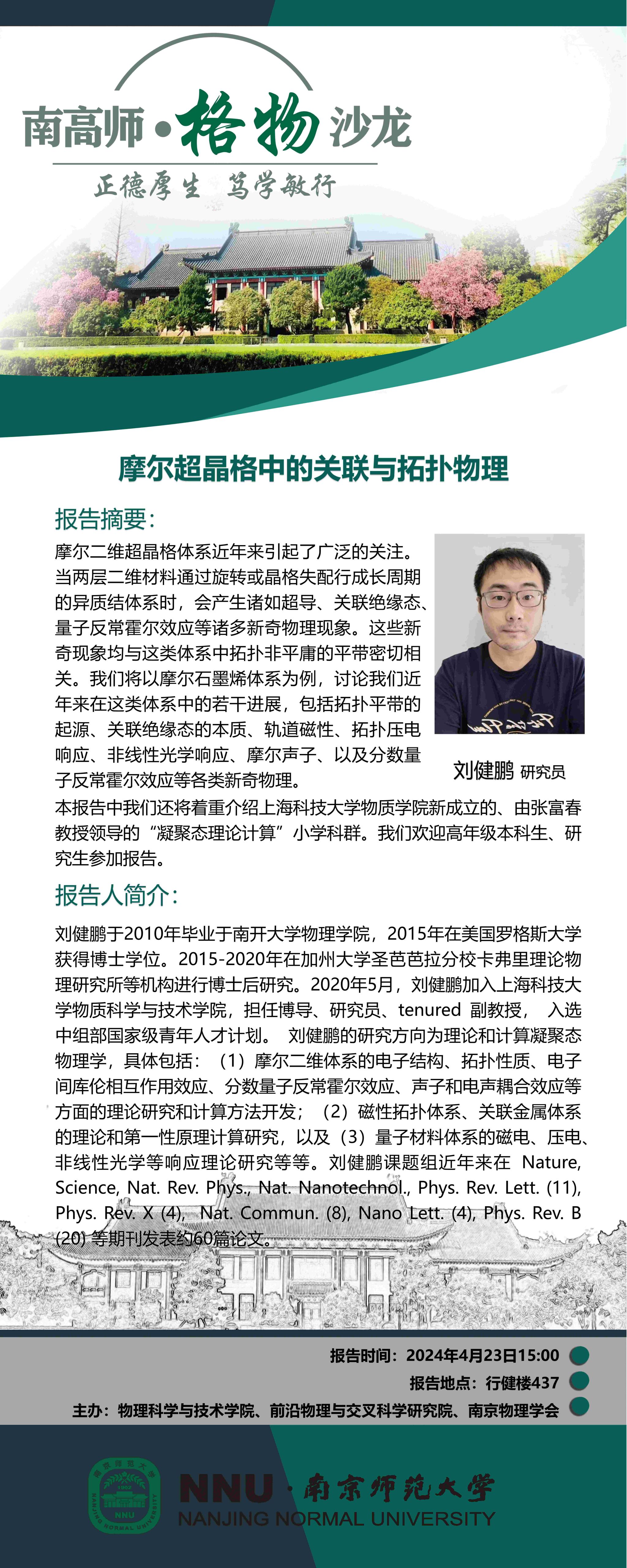 【学术预告】“南高师·格物沙龙” 摩尔超晶格中的关联与拓扑物理--刘健鹏研究员