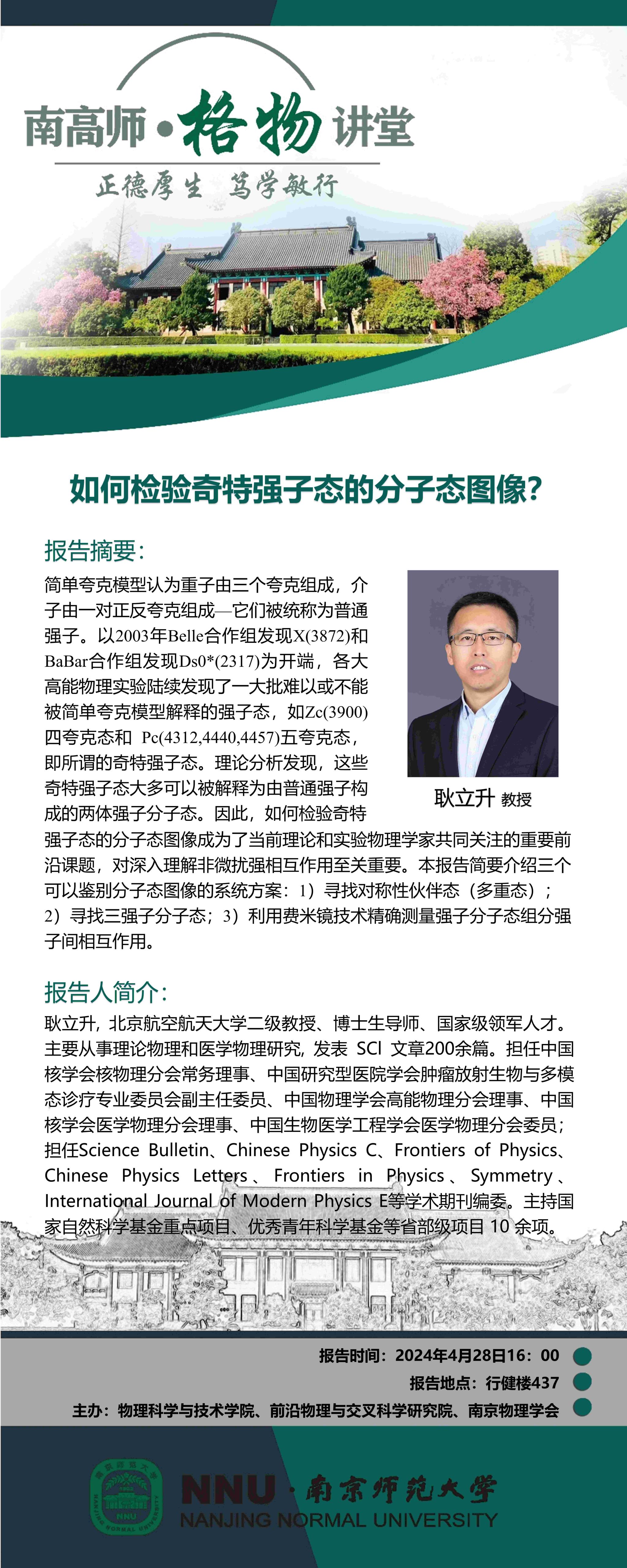 【学术预告】“南高师·格物讲堂”如何检验奇特强子态的分子态图像?--耿立升教授
