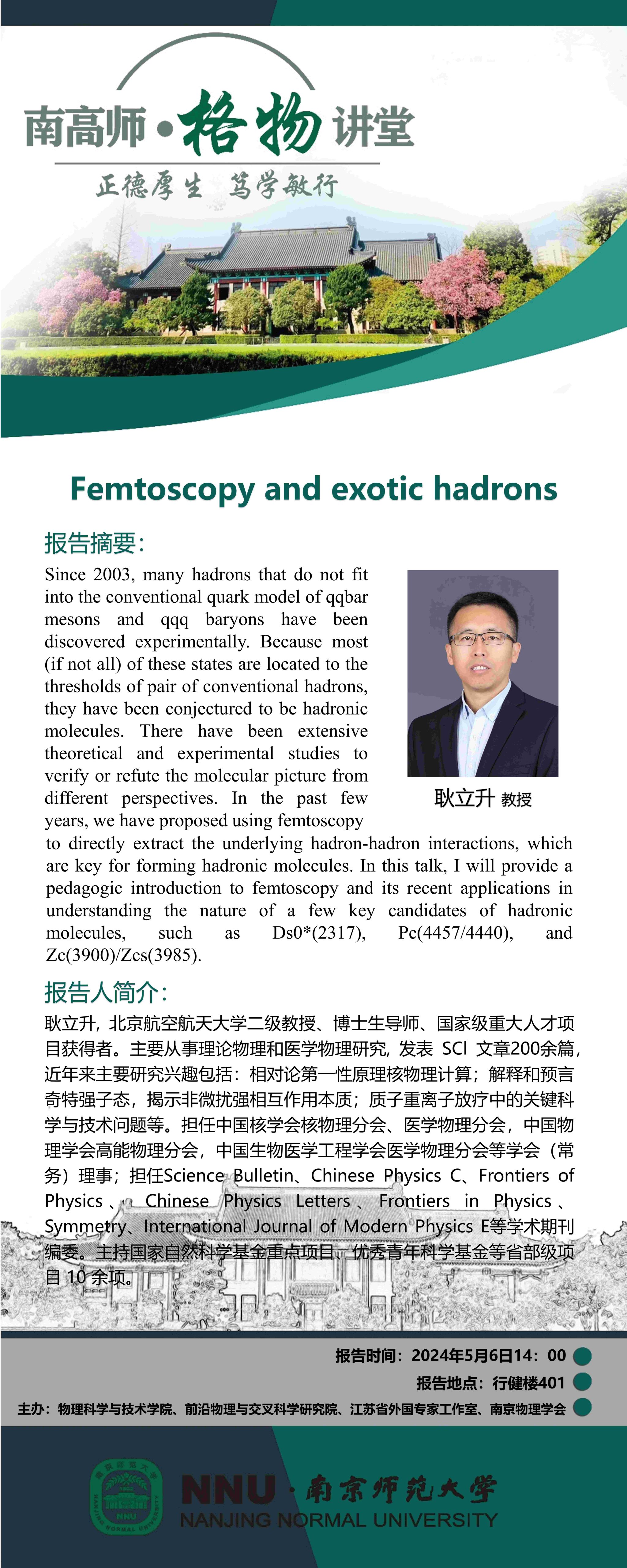 【学术预告】“南高师·格物讲堂”Femtoscopy and exotic hadrons--耿立升教授