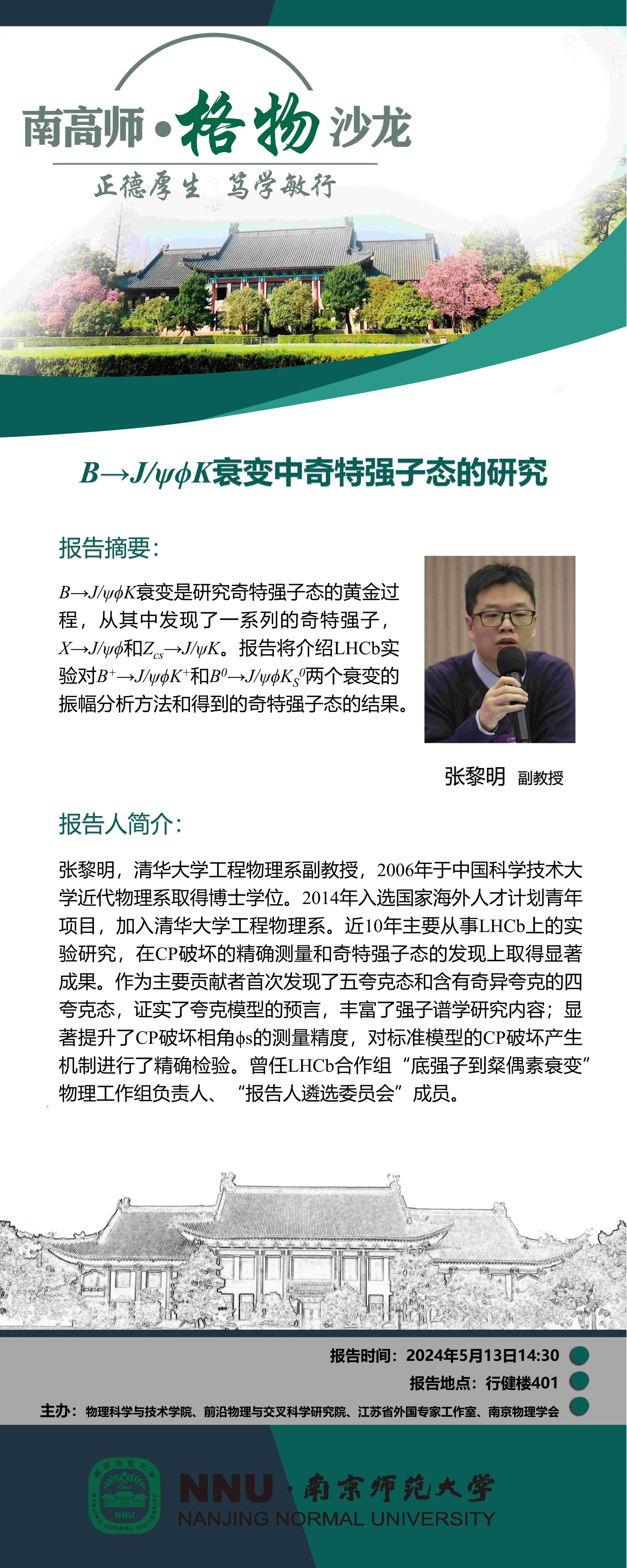 【学术预告】“南高师·格物沙龙” B→J/ψϕK衰变中奇特强子态的研究--张黎明副教授