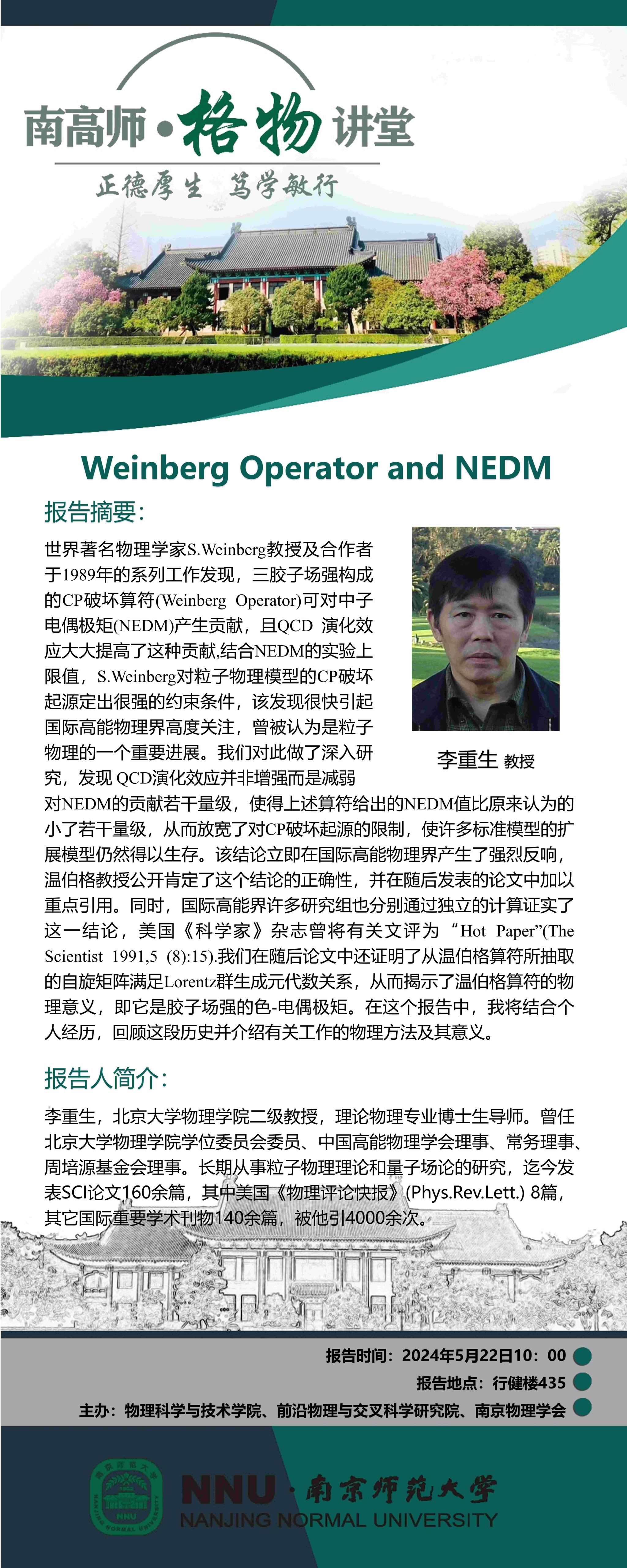 【学术预告】“南高师·格物讲堂”Weinberg Operator and NEDM--李重生教授