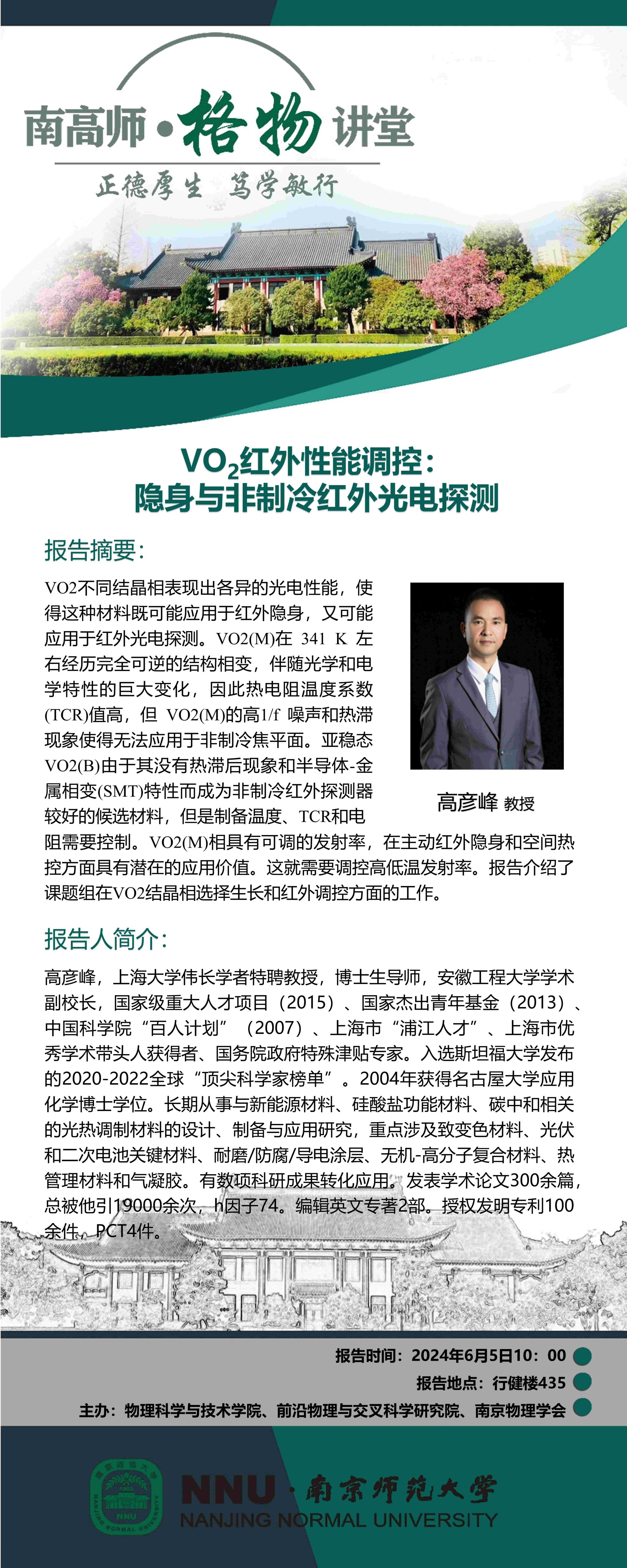 【学术预告】“南高师·格物讲堂”VO2红外性能调控:隐身与非制冷红外光电探测--高彦峰教授