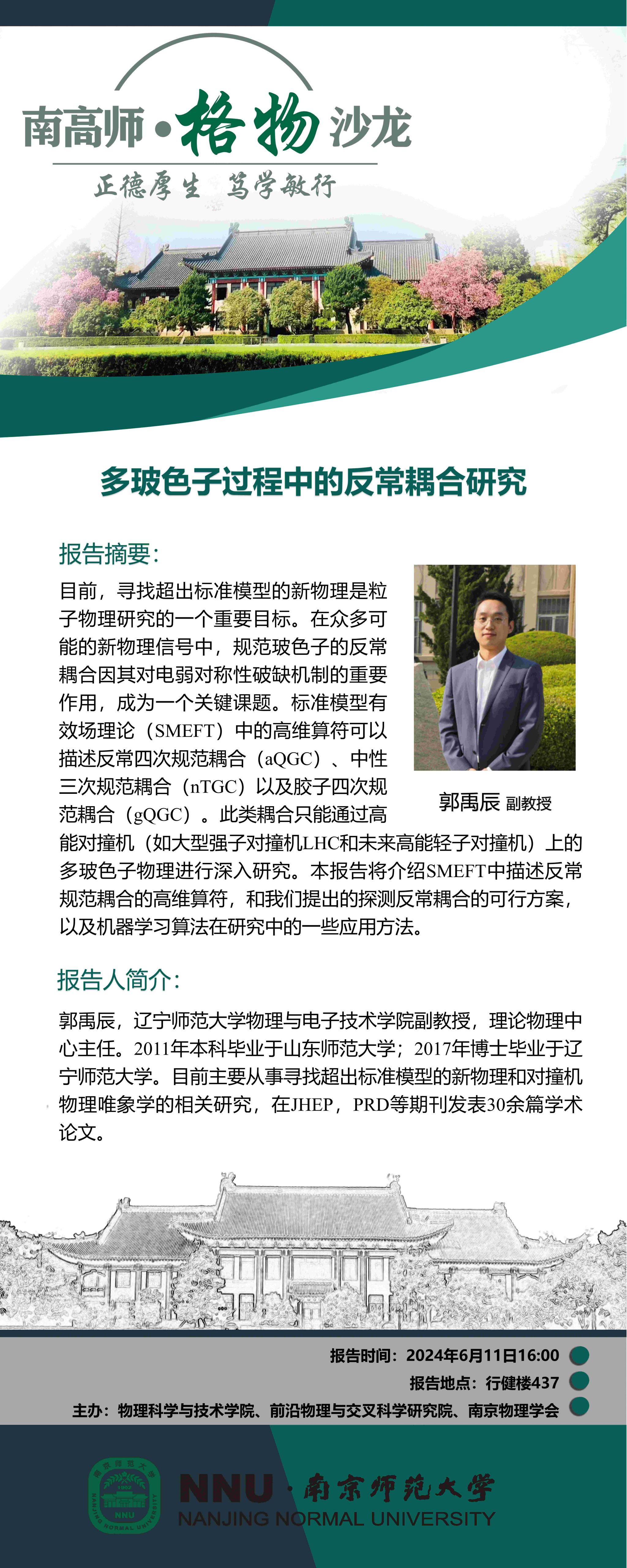 【学术预告】“南高师·格物沙龙” 多玻色子过程中的反常耦合研究--郭禹辰副教授