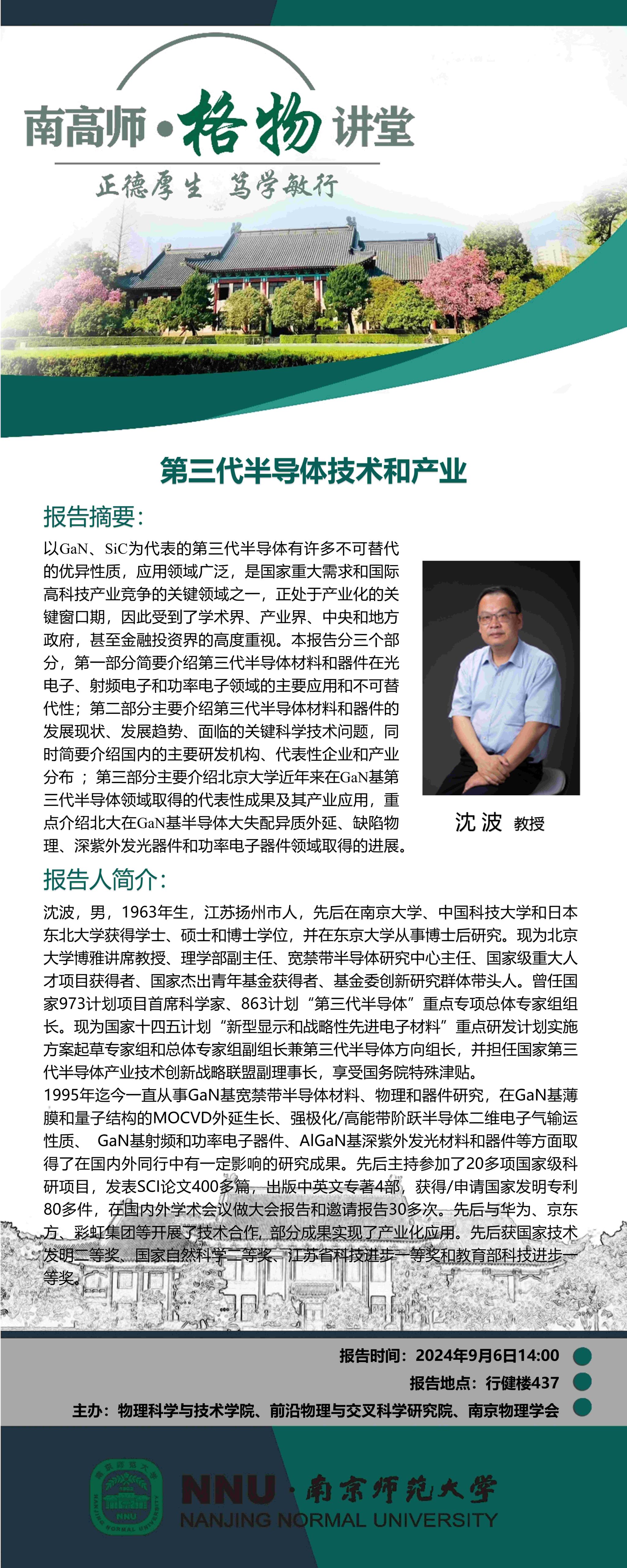 【学术预告】“南高师·格物讲堂” 第三代半导体技术和产业--沈波教授
