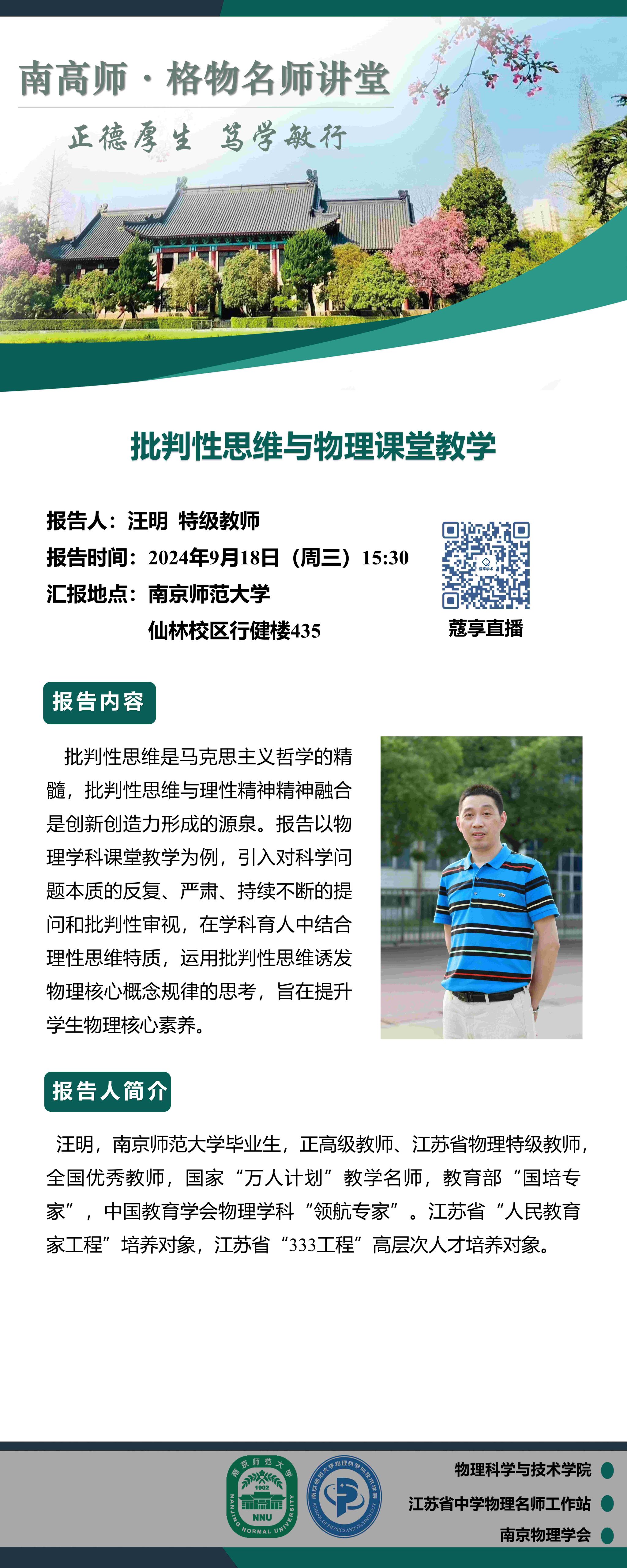 【学术预告】“南高师·格物名师讲堂” 批判性思维与物理课堂教学--汪明老师
