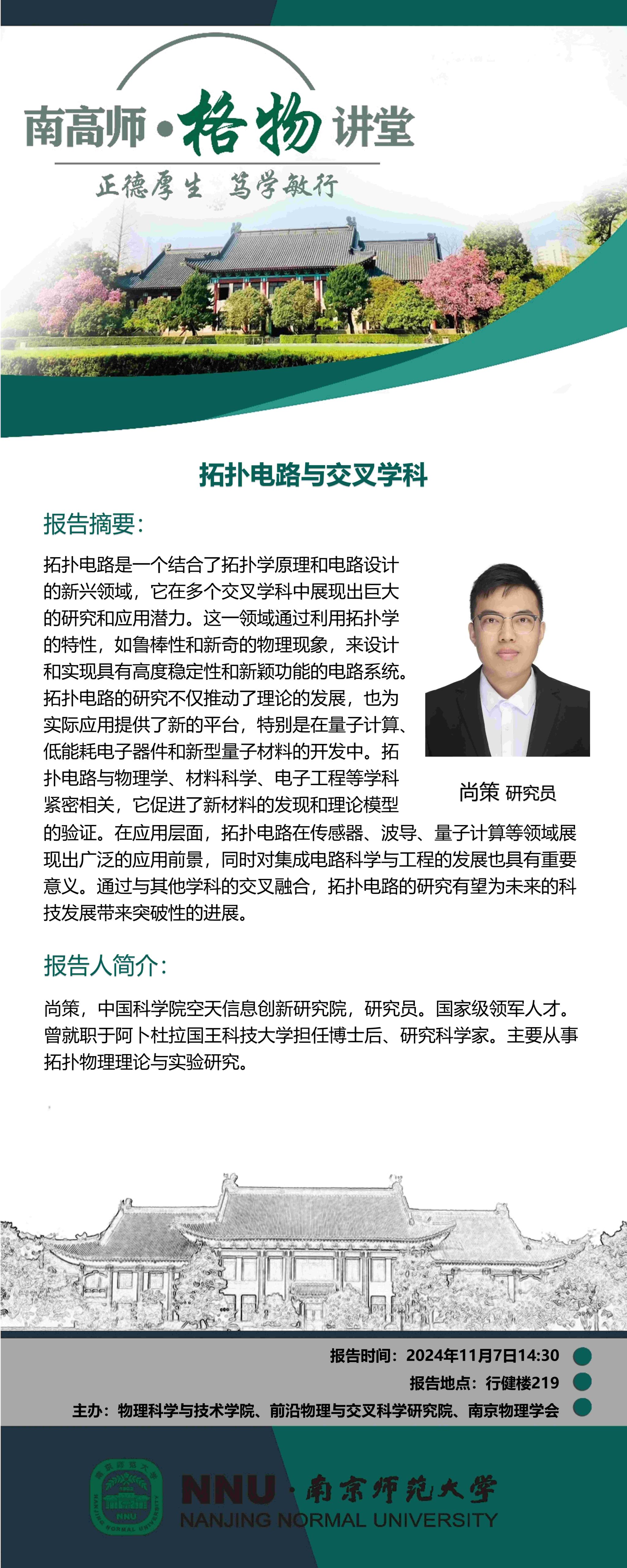 【学术预告】“南高师·格物讲堂” 拓扑电路与交叉学科--尚策研究员