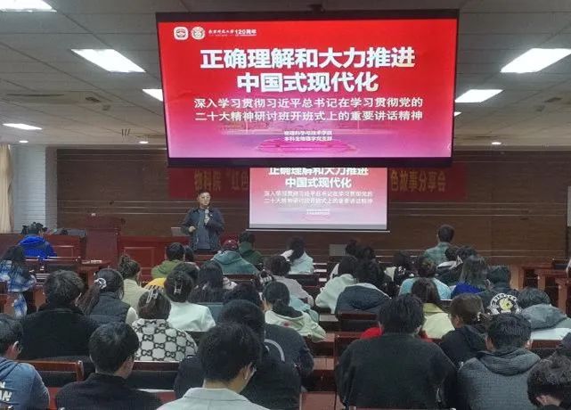 首先,党员同志们共同学习了习近平总书记在学习贯彻党的二十大精神研讨班开班式上的重要讲话精神。本科支部张天宇同志以“正确理解和大力推进中国式现代化”为题进行领学,他介绍到,二十大报告中,习近平总书记把中国式现代化作为一个鲜明的主题,把沿着中国式现代化道路实现中华民族伟大复兴作为党的中心任务。紧接着,张天宇同志结合实际建设案例和切身感受,介绍铁路交通、水路交通、公路交通等基础设施建设、航空航天、科技水平、探索考察等科学领域的发展和农业生产发展情况等方面的重大成就,直观地展示中国式现代化道路的独特发展历程。最后,通过观看《新闻联播》节选,一起重温习近平总书记在研讨班开班式上的讲话。