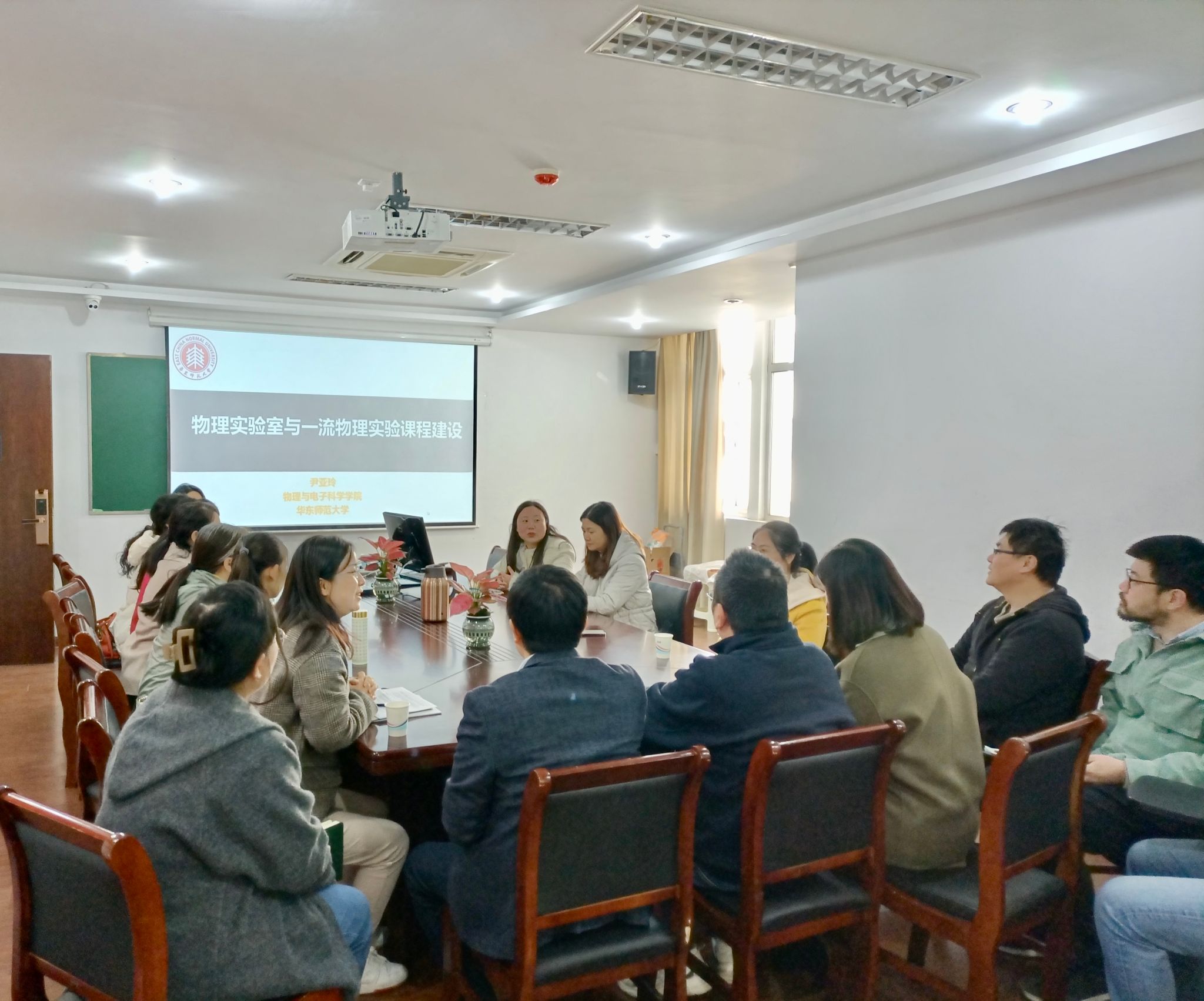 党课讲授中,尹亚玲老师首先对华东师大物理实验教学中心党支部及各实验室的职能、工作进行简单介绍。随后,尹亚玲老师围绕物理实验室建设、专业实验课程体系以及极具特色的校企合作课程、物理实验虚拟仿真教学平台等方面开展详细地报告。党课之后,各个支部的老师针对党支部工作开展,本科生、研究生教学,大学生物理竞赛、师范生技能比赛,实验室管理等问题进行了深入交流。