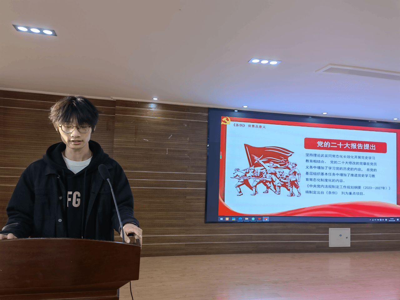 3月25日,研究生思行党支部在行健楼435会议室开展学习,由支部组织委员张诗洁主持。张诗洁同志从《条例》颁布的背景和意义出发,概括《条例》的主要内容,着重阐释了党的创新理论和伟大建党精神两大要点,引导大家要将学习党的创新理论、党史内容与建党精神相融合,转化为推动工作的强大动力。
