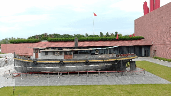 图中是纪念馆入口处安置的国家一级文物“渡江第一船”——“京电号”小火轮,站在小火轮前,同志们深切感受到革命先辈们在艰苦条件下不畏牺牲、勇往直前的革命精神。这种精神激励着我们铭记历史,不忘初心,时刻铭记为共产主义事业奋斗终身的誓言。
