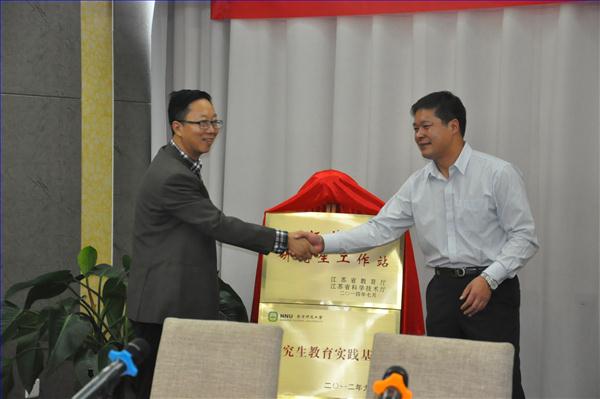 书记周海忠教授与吴江太湖新城经济发展局局长朱雪忠先生一起签署了合作协议并为南师大研究生实习基地揭牌。