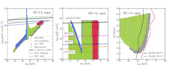 图2:左为同时满足银心GeV伽马射线超出和反质子超出的暗物质质量区间(红色区域);中为类标准模型希格斯粒子(SM-like Higgs)共振湮灭过程在暗物质直接探测上的观测前景(蓝色区域);右为暗物质粒子与次轻中性希格斯粒子(A)共同湮灭过程在高亮度强子对撞机上的可观测预期(绿色区域)。