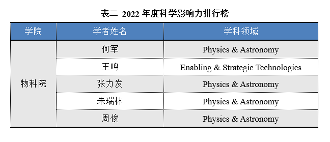 该榜单基于Scopus数据库,依照科技工作者科研产出、Google Scholar Metrics期刊评分、H指数、成果被引、成果中作者排序位置等参数进行综合评估。榜单分为“终身科学影响力排行榜(career-long impact)”和“2022年度科学影响力排行榜(single-year impact)”两个榜单,分别对应职业生涯(1960-2022)、上一年度(2021-2021)两个时间区间的综合数据。榜单涵盖了22个领域和176个子领域,从近千万名科学家中遴选出世界排名前2%的科学家,较客观地反映了学者的影响力。