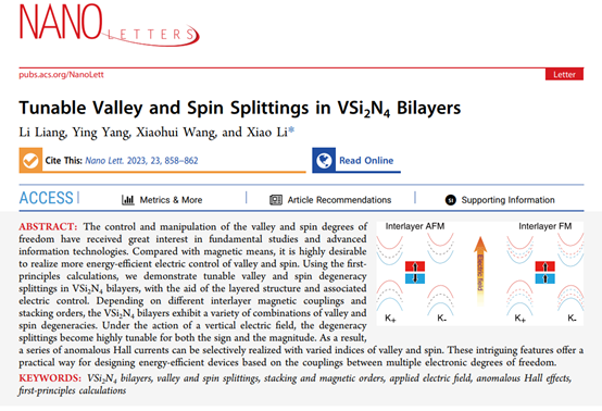 李晓教授课题组在能谷和自旋劈裂的调控方面取得研究进展。相关结果以“Tunable Valley and Spin Splitting in VSi2N4 Bilayers”为题发表在国际顶级期刊《Nano Letters》。课题组2020级在读研究生梁丽为论文的第一作者,李晓教授为论文的通讯作者。