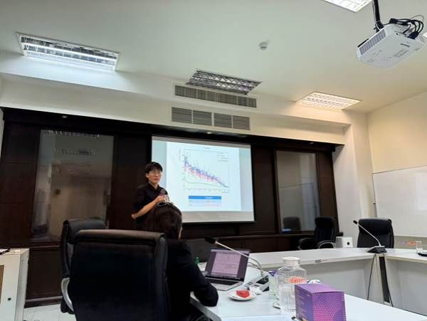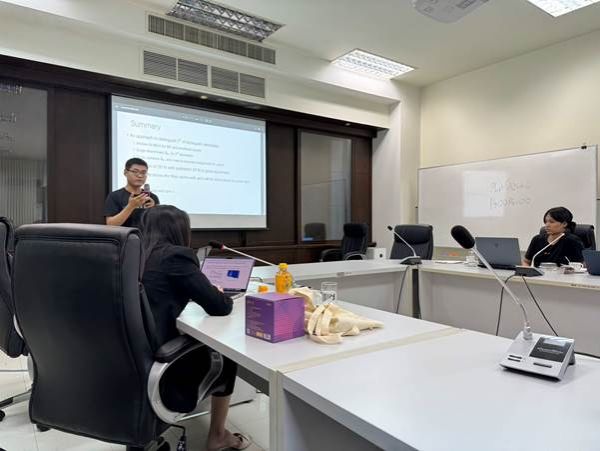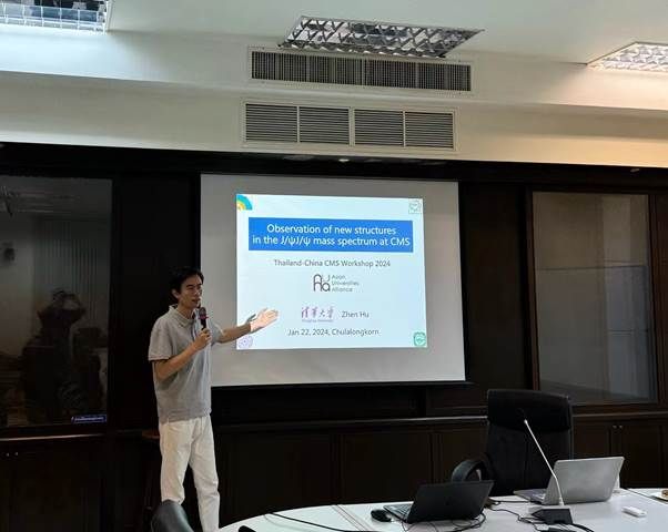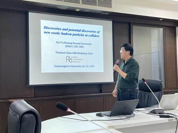Spin-parity Analysis”和“Observation of 𝛶(nS)+J/ѱ and inclusive cross section measurement”的学术报告。1月23日下午,在朱拉隆功大学的高能物理讲座课上,南京师范大学教授易凯面向朱大物理系学生做专题报告,系统介绍了在对撞机上发现的新奇特强子态。随后,清华大学胡震副教授做专题报告详细讲解了在CMS实验的双Jpsi质量谱上观测到的新结构。