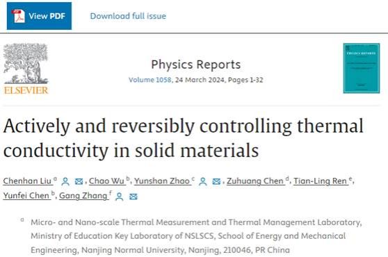 赵云山教授与南京师范大学能源与机械工程学院刘晨晗教授、新加坡高性能计算中心张刚教授合作在国际权威综述期刊《Physics Reports》 (2023年影响因子30,中科院一区TOP期刊) 上发表了题为“Actively and reversibly controlling thermal conductivity in solid materials”的长篇综述文章【Physics Reports 1058, 1-32 (2024)】。《Physics Reports》是物理学和交叉科学类最具影响力的国际综述性期刊之一,专门发表该领域各研究方向全球知名专家撰写的综述性论文,对相关领域的发展具有重要的引领和指导作用。该刊每期只发表一篇论文,全部由杂志编辑邀约在相关领域做出突出贡献的专家学者撰稿。本文的第一作者是南京师范大学刘晨晗教授,通讯作者为新加坡高性能计算中心张刚教授、南京师范大学赵云山教授、刘晨晗教授。东南大学陈云飞教授和吴超博士生、清华大学任天令教授和哈尔滨工业大学(深圳)陈祖煌教授也参与了这项工作。原文链接如下://www.sciencedirect.com/science/article/pii/S0370157324000036?dgcid=coauthor。