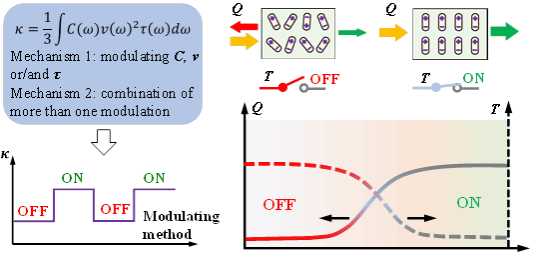 导热系数的可逆调控(热开关)可实时精准调节热路中热流的大小,是一种高效的热控技术,其能够解决器件发展在散热、温度稳定性和能源利用率上的短板,有利于提高能源利用率和电子器件寿命。然而,像电子传输一样可控的声子传输尚未实现。困难在于声子和外部激励之间缺乏直接联系。 为了实现可控声子输运的目标,全面系统地理解热调控至关重要。考虑到热开关的性能很大程度上取决于材料本身的性质,本文回顾了五种固体材料(包括铁电材料、铁磁材料、纳米材料和纳米结构、聚合物和相变材料)热调控的最新进展。在每种类型的固体材料中,详细回顾了不同的导热系数调控方法并深入分析了背后的调控机制,旨在寻找到提高其热开关性能的新方法新机制。对五种固体材料进行了热开关性能的对比分析,旨在结合不同材料的优点开发出响应速度快、开关比大、适用温度范围广和工作寿命长的热开关,这是实现可控热输运的关键。此外,本文还指出了热开关领域当前的挑战和未来的前景,以突出这一不断发展的领域中新兴的研究方向。由衷希望本篇综述能引起更多关于热输运调控的关注,早日实现可控的热输运,造福人类社会。