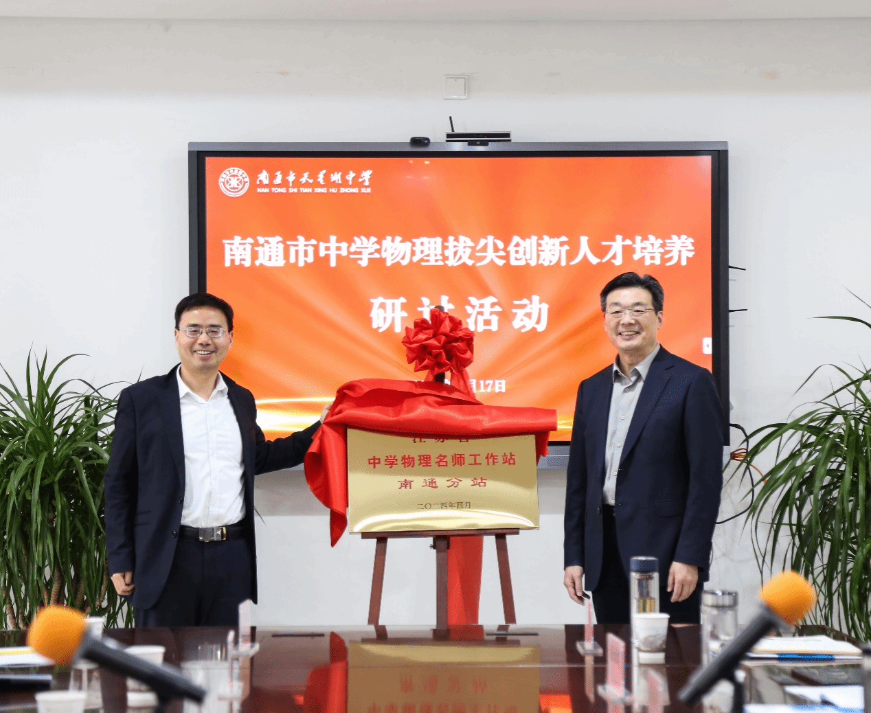 院长张力发和南通市教育科学研究院院长徐卫华共同为“江苏省中学物理名师工作站南通分站”揭牌。