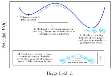 过冷相变被广泛认为是SGWB的可能来源,与超出标准模型的新物理密切相关。武雷教授课题组(Peter Athron、卢致廷、武雷、吴永成及硕士生徐忠秀)与合作者(西交利物浦大学Andrew Fowlie、莫纳什大学Lachlan Morris)研究了过冷相变作为解释纳赫兹频率信号的可能性。过冷相变发生在比通常电弱相变预期的更低的温度。由于宇宙在一段长时间内保持在亚稳态的“假真空”状态,成核被延迟,使得产生的引力波有所不同。通过严格解析计算和复杂的宇宙学相变模拟,课题组发现过冷相变作为SGWB可行解释面临两个主要挑战:1)相变要产生SGWB,需要渗透(遍布整个宇宙)并完成(达到旧相被新相取代的状态)。然而,超冷可能导致该过程无法完成,因为宇宙的快速膨胀,导致形成的气泡没有时间连接和渗透;2)即使可以避免完成问题,相变释放的能量也会将宇宙加热到高温,并回到推动相变的新物理能标。这些问题普遍存在于过冷相变理论模型中。这一发现基本排除了过冷相变作为解释目前PTA合作组观测到的纳赫兹引力波的可能性,对探索超低频引力波物理起源具有重要意义。