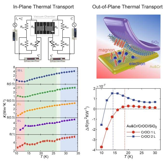 少层范德华材料中的长程磁序已被证实,但关于磁子、声子以及磁振子极化子在相变温度附近和单层极限下的相变行为和磁声相互作用仍不清晰。热输运测量是一种研究磁性材料中磁子、声子及其相互作用的基本方法,得益于磁声相互作用在热输运过程中的显著影响,热输运测量也成为一种非常灵敏的磁性探针。CrOCl是一种稳定的、易剥离的反铁磁绝缘体材料,由于其低对称性的晶格和显著的磁弹耦合,使其在低温下展现出丰富的磁相变,成为了一个研究少层磁热输运的优秀候选材料。目前,单层CrOCl中的磁基态(铁磁构型或反铁磁构型)仍存在分歧,并且层状磁性材料在单层极限附近的热输运还没有被实验所研究。因而,本工作开展了关于少层CrOCl材料的面内热输运测量和界面热输运测量,提供了大量新颖的物理现象和实验结果。