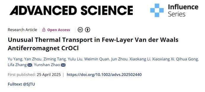 张力发教授、赵云山教授课题组在低维磁性材料热输运研究中取得重要进展。相关结果以“Unusual Thermal Transport in Few-Layer Van der Waals Antiferromagnet CrOCl”为题发表在国际重要期刊《Advanced Science》,影响因子14.3。课题组已毕业博士生杨宇为论文第一作者,网赌