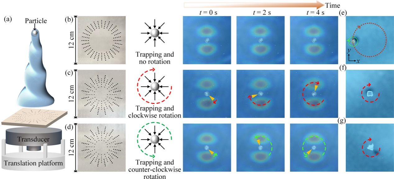 声学非接触式精确旋转操纵为微小物体的控制增加了新的操控自由度,在微机械领域(如声学驱动微型机器人)具有重要应用价值。同时,该技术还可用于生物样品的三维定位与微小物体自组装等领域。然而,实现微小物体的旋转仍面临挑战。本研究提出一种基于声波自旋角动量调制的方法,旨在实现对微小物体的复杂旋转操控。