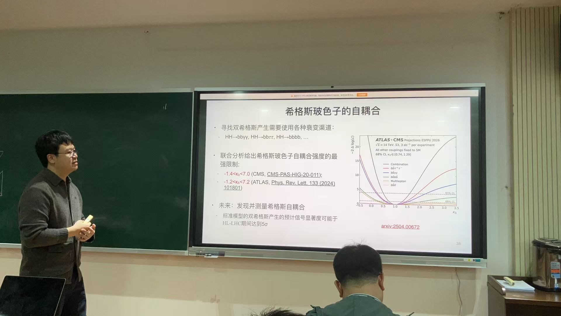 在长达一个多小时的报告中,周辰教授结合自己在大型强子对撞机(LHC)ATLAS和CMS实验中的丰富研究经验,系统回顾了希格斯玻色子的发现历程,并深入探讨了希格斯物理在当代粒子物理研究中的核心地位。他重点介绍了希格斯玻色子的产生与衰变率测量、希格斯自耦合研究、希格斯与顶夸克、粲夸克的耦合机制等等的最新实验结果,为与会者展现了标准模型检验及其延伸的最前沿进展。