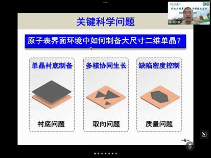 报告开始,刘开辉教授首先指出材料制备在科技发展中的重要作用。从第一代半导体的硅、第二代半导体的砷化镓到第三代半导体的氮化镓,这些材料的成功制备无不推动了先进器件的研究和应用。21世纪的高科技发展需要依赖于新型单晶材料的开发和制造。进而,刘开辉教授为与会观众介绍了他所带领的课题组在界面调控二维材料超快生长设计、米级二维单晶制造、二维材料光纤器件方向的研究进展。他们发展的材料和技术有望应用于电子器件、光学器件、声学器件、光电催化、热管理工程等领域。