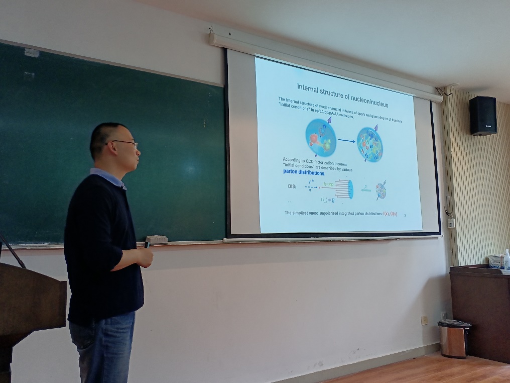 周剑教授首先介绍了美国批准建设的电子离子对撞机(EIC)和中国未来计划建造的极化电子离子对撞机(EICC)的物理目标,指出胶子饱和效应和小x物理研究的重要科学意义。周剑教授接着介绍观测线性极化胶子的方法,并解释了在喷注产生过程中方位角的关联与不对称性,最后强调软胶子重求和的重要作用。此次报告内容详实,讲解深入浅出,不仅丰富了大家的知识,也拓展了大家的视野。最后在场师生针对软胶子重求和、方位角关联等内容进行了提问,周剑教授对每个问题进行了耐心的解答。