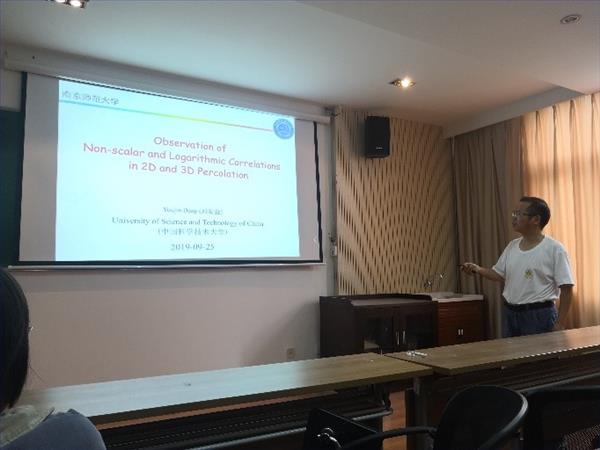 邓友金教授汇报了基于蒙特卡洛方法对逾渗模型的相关研究,指出了在临界阀值,两点间关联函数随距离的依赖关系为对数,而非传统的指数,该规律在二维和三维体系中普遍存在。报告结束后,邓友金教授对老师和同学们的提出的问题进行了详细解答。