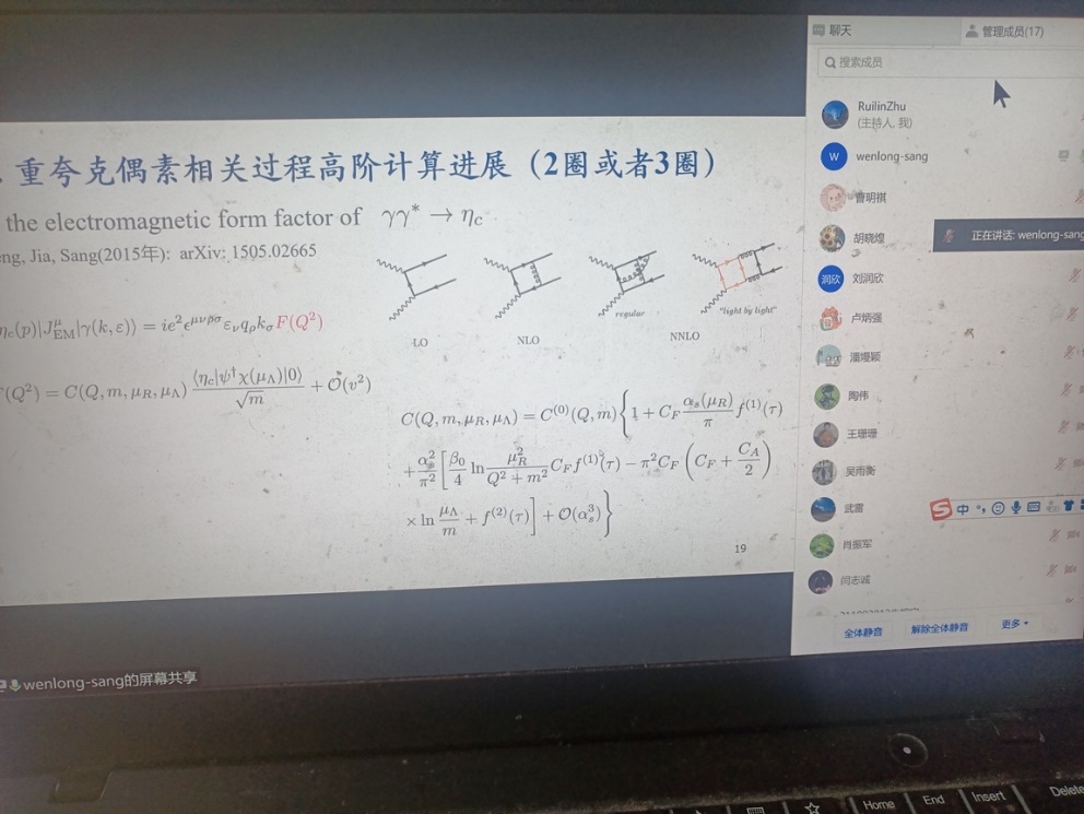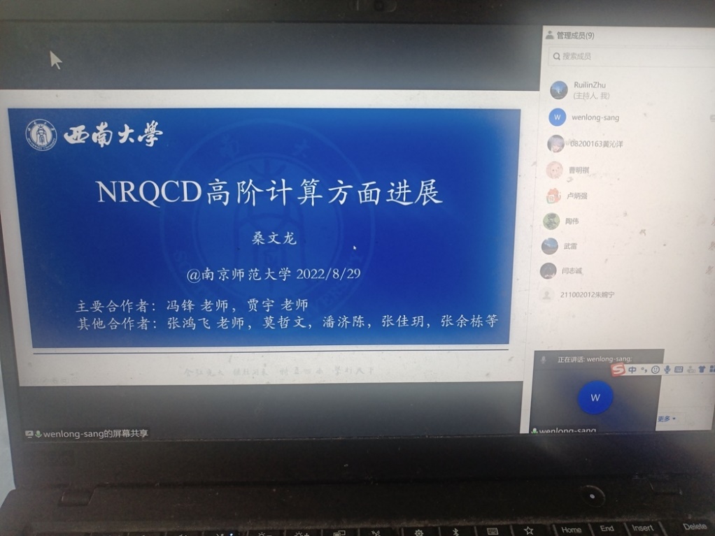 在报告过程中,桑文龙教授首先采用通俗易懂的方式对NRQCD因子化理论做了介绍。然后基于NRQCD因子化理论,桑文龙教授报告了国内外关于重夸克偶素物理高阶修正的最前沿成果。包含有重夸克偶素产生过程、衰变常数、遍举和单举等一系列衰变过程的二圈和三圈修正。桑文龙教授也介绍了NRQCD因子化定理,相关计算过程中的紫外和红外发散性质,以及相应的重整化和因子化公式。最后桑文龙也提到最新的三圈修正计算表明重夸克偶素一些过程的微扰收敛性不是很友好,挑战了传统的观点,这些问题使得我们需要对传统的理论做进一步认识和理解。桑文龙教授的报告内容丰富、详实深刻、精彩生动,在线的师生均表示受益匪浅。在场师生积极参与提问、讨论,线上报告会在热烈的气氛中圆满结束。